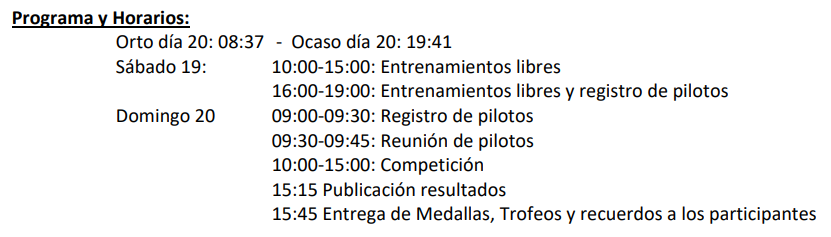 Para mi, el reglamento de la especialidad puede resumirse en una frase… Conseguir un vuelo a vela (sin motor) de 10 minutos entre el despegue y la toma con un máximo uso de motor de 30 segundos, si uso mas de 30″ de motor, la toma he de hacerla antes de transcurridos los 10′ 30″ desde el despegue.