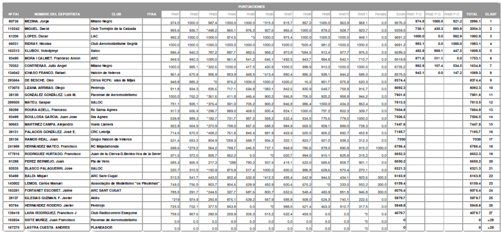 Los vuelos serían anormalmente cortos (se repetían un poco los vuelos en Aljaraque), aunque en alguno se llegara bastante alto, no en el despegue pero si por la acción de corrientes ascendentes y hubiera cierto problema para poner de nuevo el modelo en tierra, a continuación podemos ver las puntuaciones de los vuelos, desde los 1:57,00 de Adan hasta los 8:07,55 de Coronilla (Gimenez casi lo borda con su 8:00,51) se repartieron los tiempos de vuelo entre casi los cuatro minutos y poco mas de dos, superando los seis minutos sólo cuatro de los cuarenta y nueve posibles.