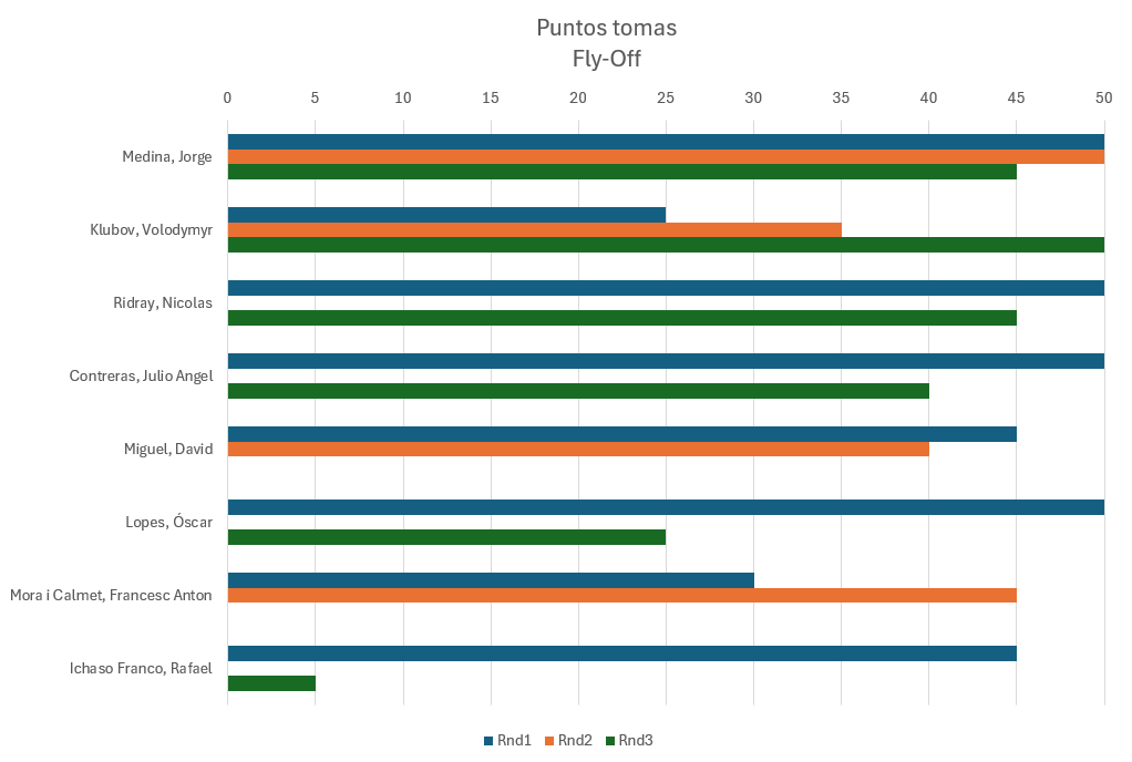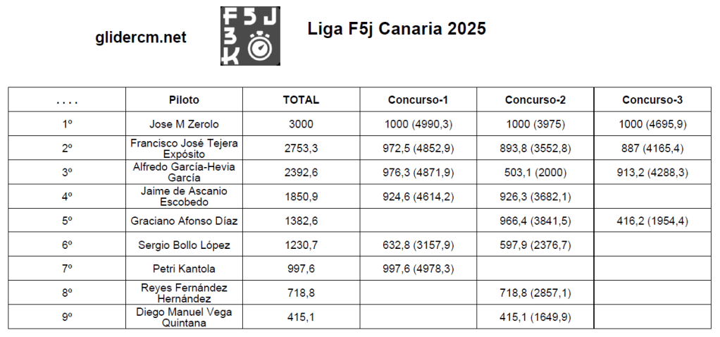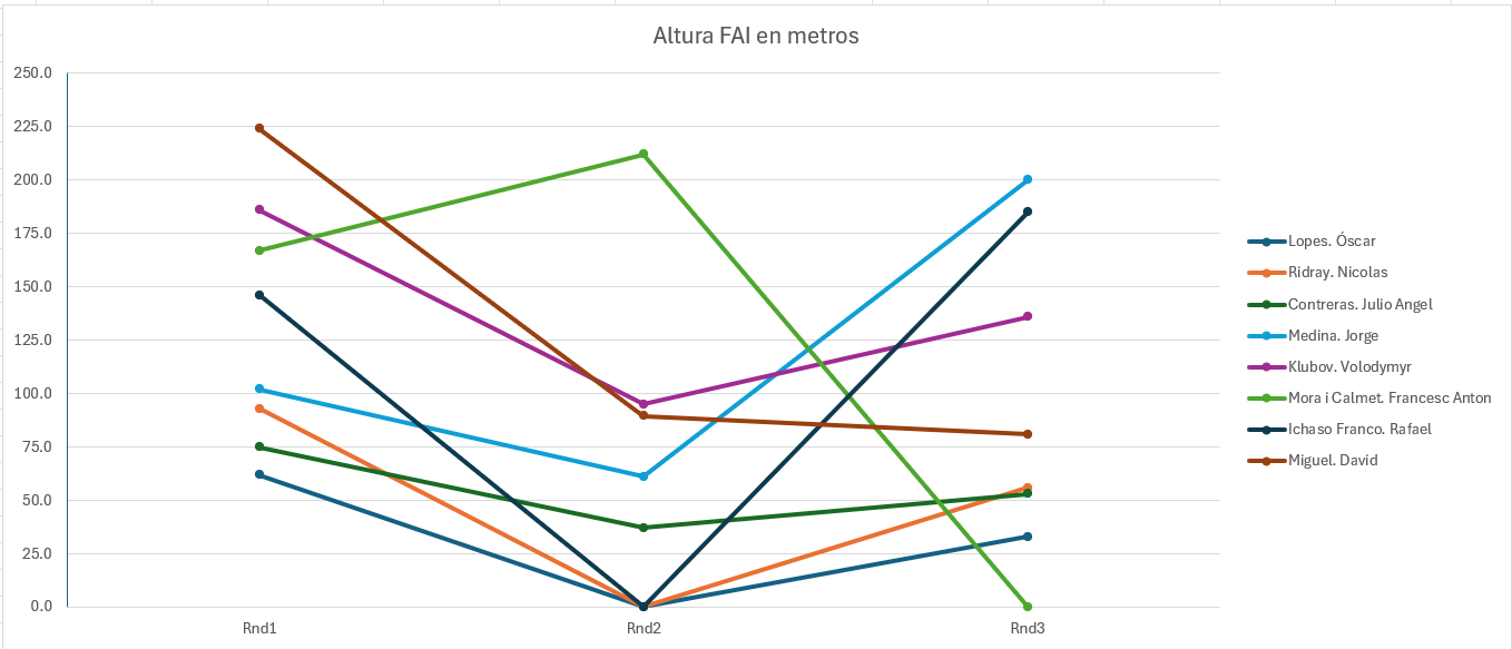 Nos inscribimos veintinueve pilotos, pero por causas no queridas sólo pudimos estar 27; menos participantes que en anteriores ocasiones pero ganamos en el numero de vuelos todos los pilotos, en el 2022 dimos 10 (30 pilotos), en el 2023 9 (40 pilotos), en el 2024 6 (33 pilotos) y este año 2025 hemos dado 11; los buenos dieron 3 más de Fly-Off. En el mundial 2025 en Argentina se dieron 13 y 4 en el Fly-off. Los resultados serian: