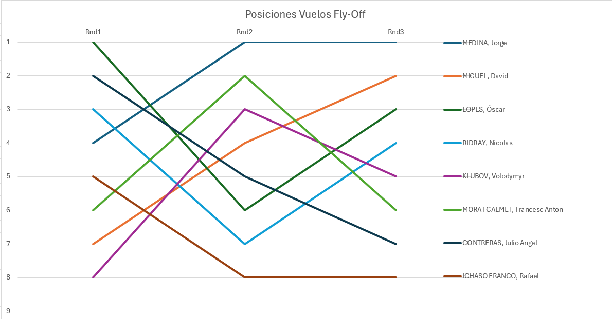 Las posiciones en la clasificación fueron movidas, sobre todo pasadas las primeras posiciones; los tres primeros en los vuelos calificatorios lo fueron desde el principio. No menos movidas fueron en el Fly-off.