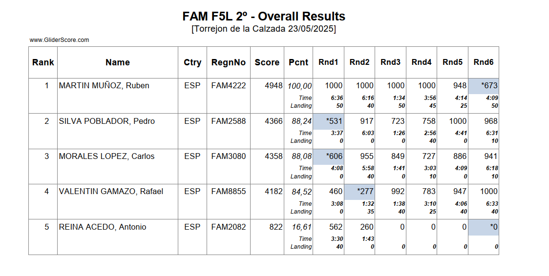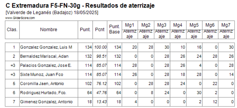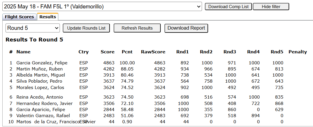 Nos inscribimos veintinueve pilotos, pero por causas no queridas sólo pudimos estar 27; menos participantes que en anteriores ocasiones pero ganamos en el numero de vuelos todos los pilotos, en el 2022 dimos 10 (30 pilotos), en el 2023 9 (40 pilotos), en el 2024 6 (33 pilotos) y este año 2025 hemos dado 11; los buenos dieron 3 más de Fly-Off. En el mundial 2025 en Argentina se dieron 13 y 4 en el Fly-off. Los resultados serian: