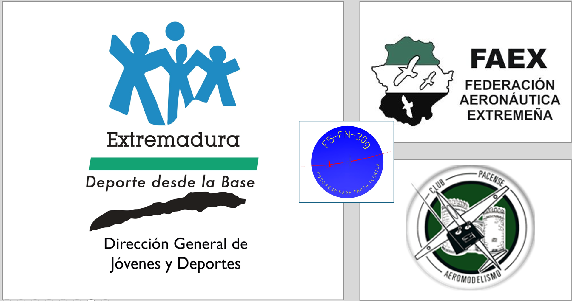 De nuevo el Club Pacense de Aeromodelismo bajo el paraguas de la Federación Aeronáutica Extremeña y la colaboración de la Dirección General de Jovenes y Deportes de la Junta de Extremadura, organiza un perfecto campeonato con la ayuda de los socios del club.