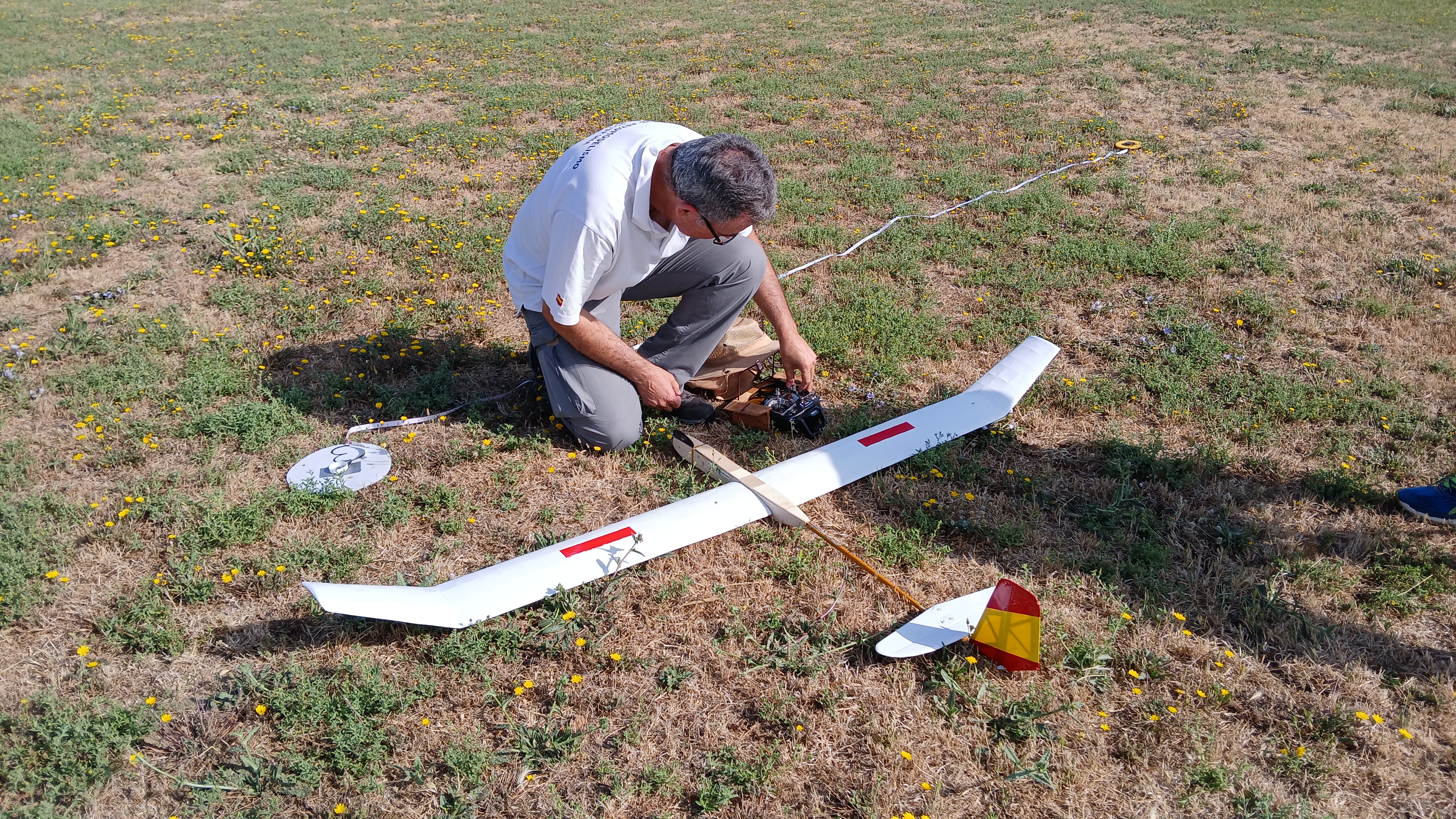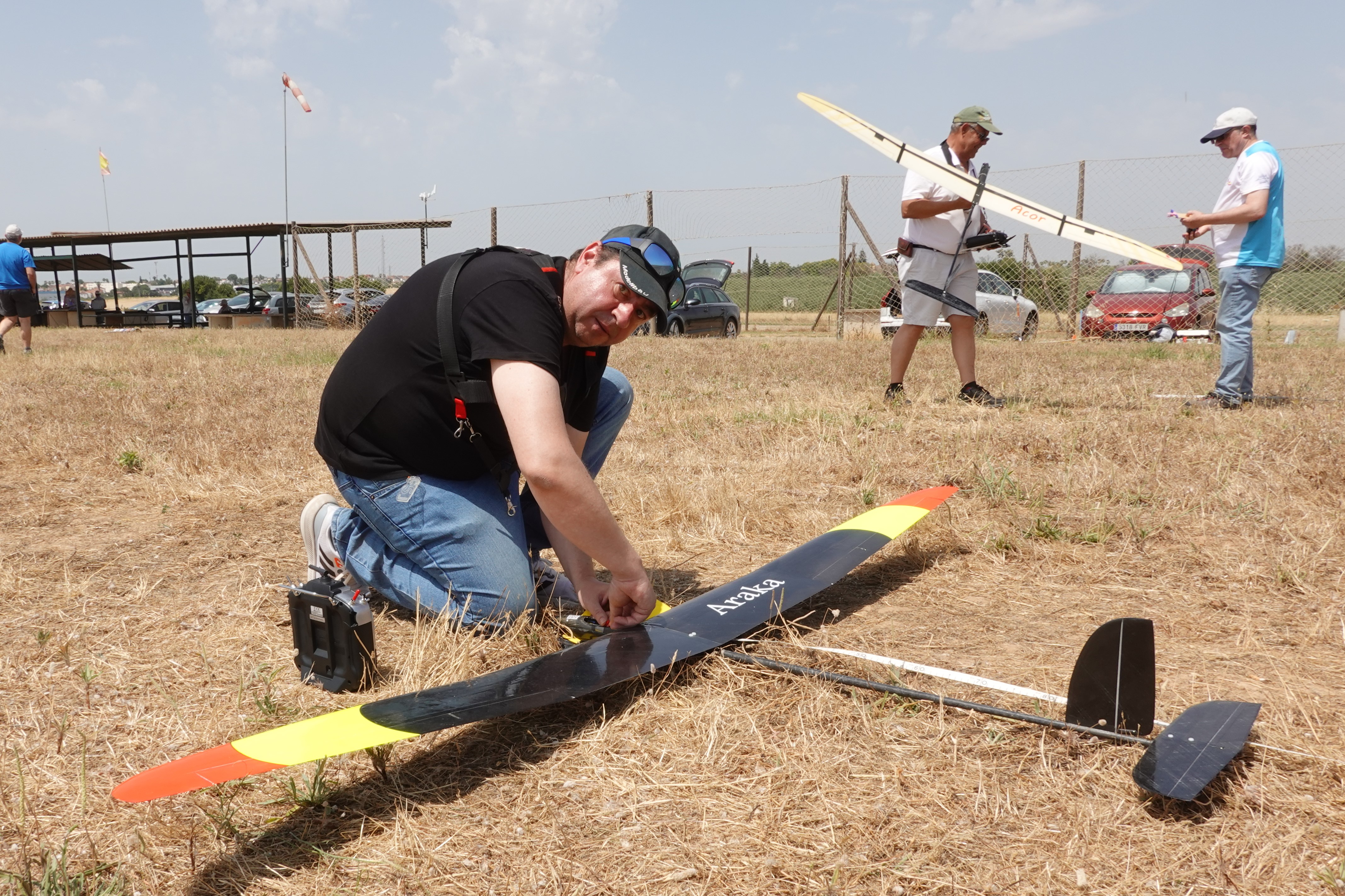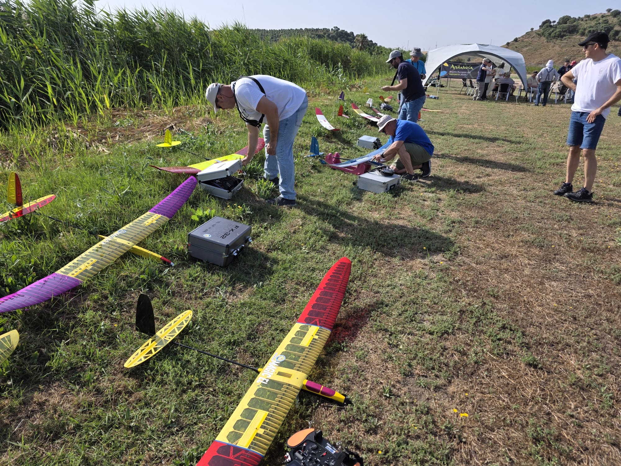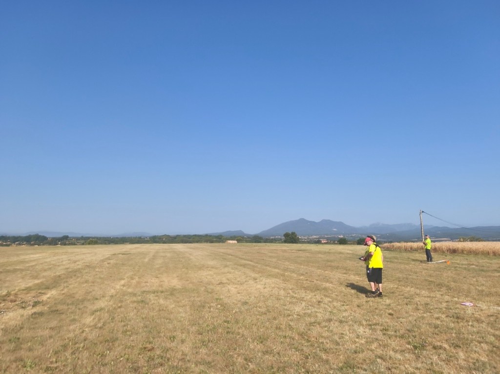 Mañana empieza el Campeonato de España F5J. Hoy es tiempo para el montaje, probar toda la infraestructura (cintas, dianas, audio, pantalla, carpa, bebidas, etc…) y también para tomar la medida al campo con los vuelos de entrenamiento.