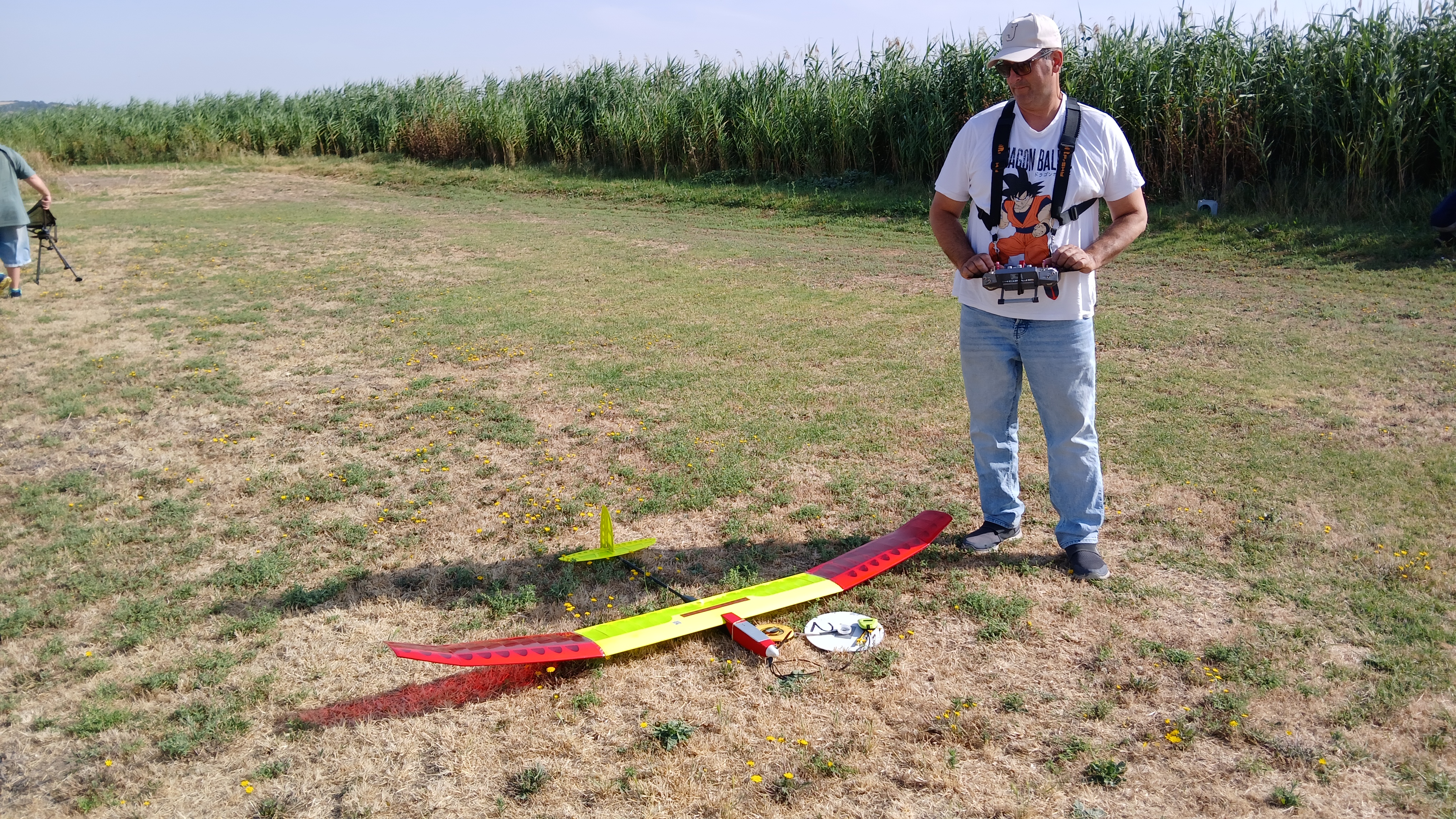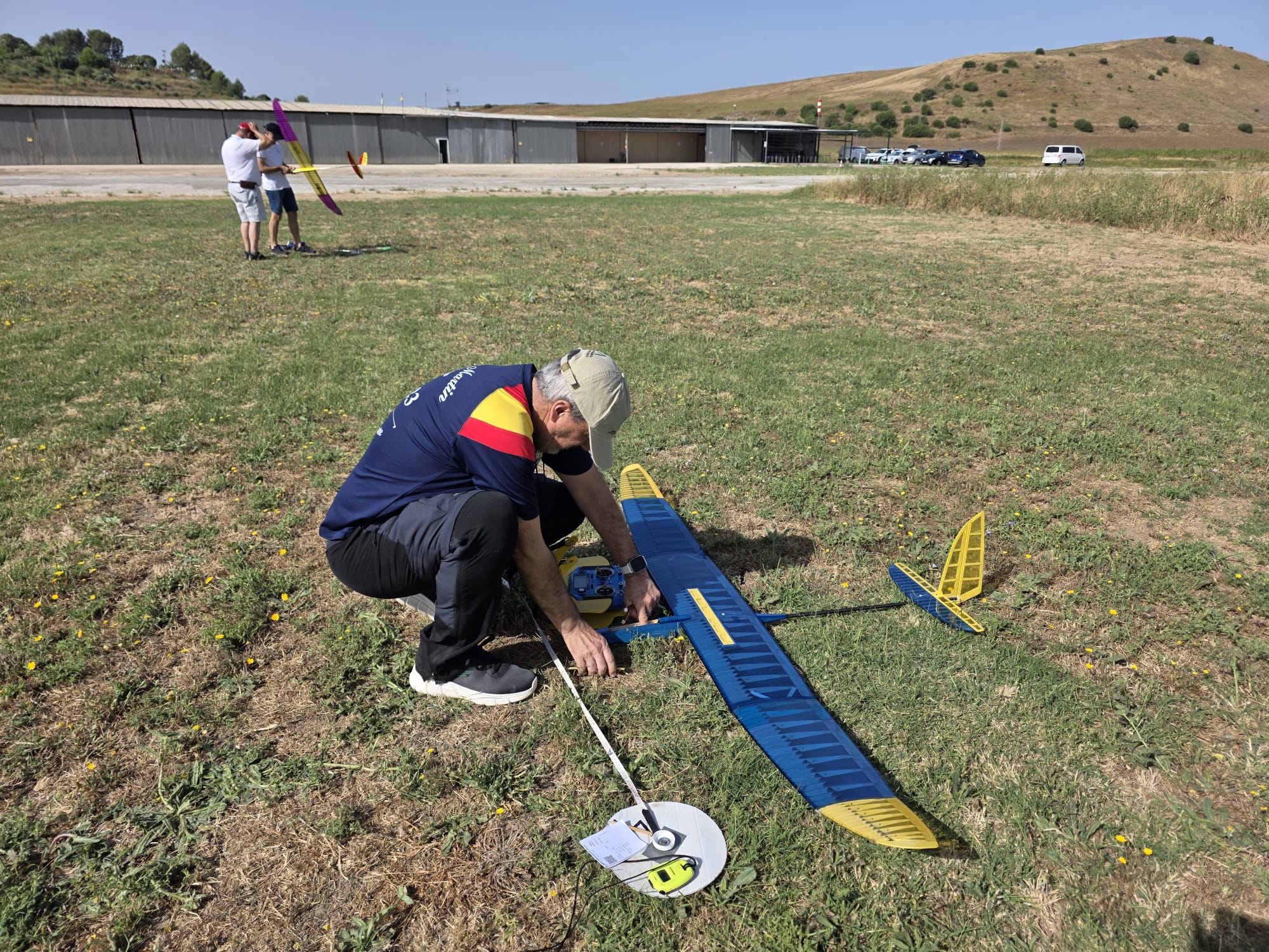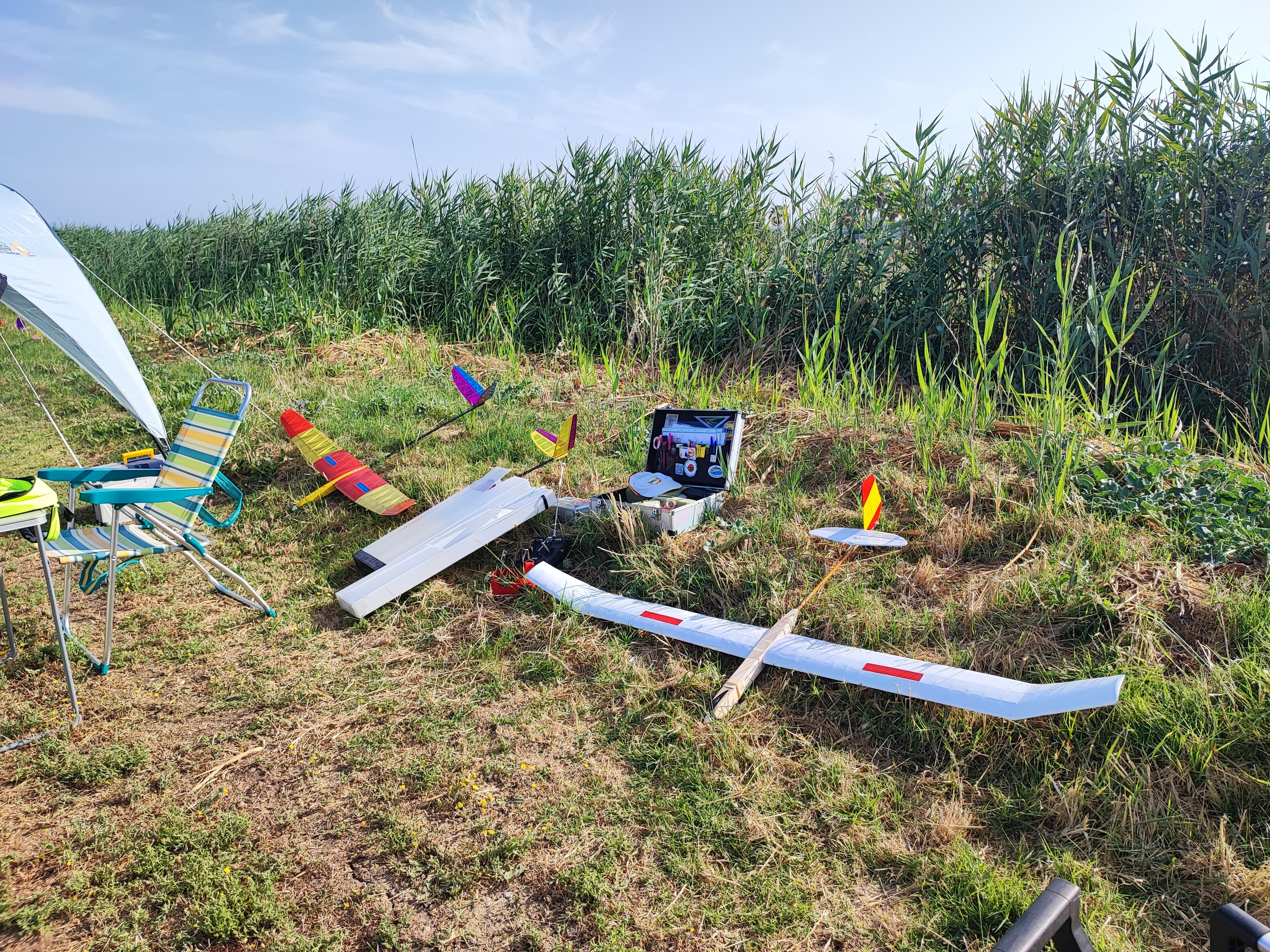 Mañana empieza el Campeonato de España F5J. Hoy es tiempo para el montaje, probar toda la infraestructura (cintas, dianas, audio, pantalla, carpa, bebidas, etc…) y también para tomar la medida al campo con los vuelos de entrenamiento.