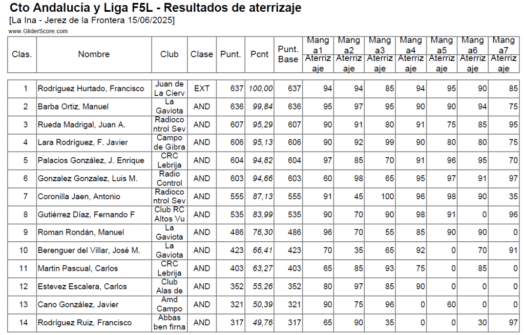 Estas condiciones favorecieron que los mejores pilotos pudieran mostrarnos todo su talento. Julio estuvo intratable, con una regularidad envidiable. Vuelos de 9.55, diana y cortes entre 43 y 125 metros le hicieron acabar la fase clasificatoria en primer lugar, ganando todas sus mangas a excepción del descarte. Los siguientes clasificados Toni Mateu, Jorge Medina y Nicolas Ridray tampoco le fueron a la zaga. Prácticamente todos los cortes por debajo de los 100 metros y siempre consiguiendo los tiempos marcó una diferencia entre ellos de solo 140 puntos. A partir de ahí un salto importante con los demás pilotos que hicimos lo que pudimos…