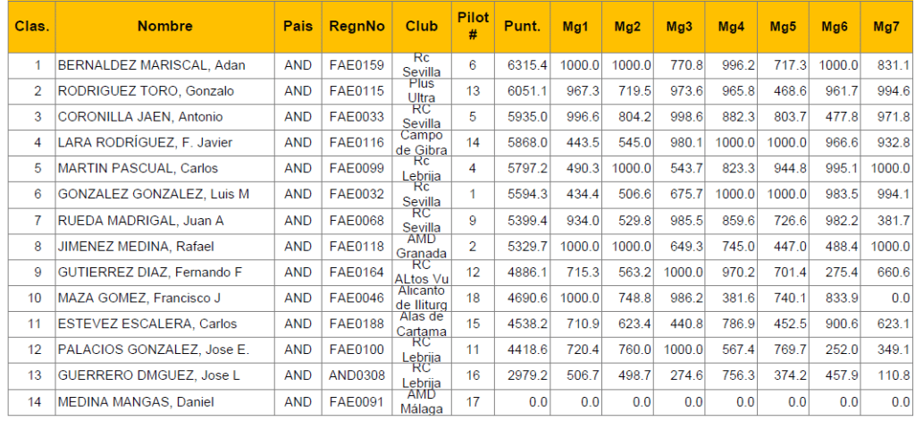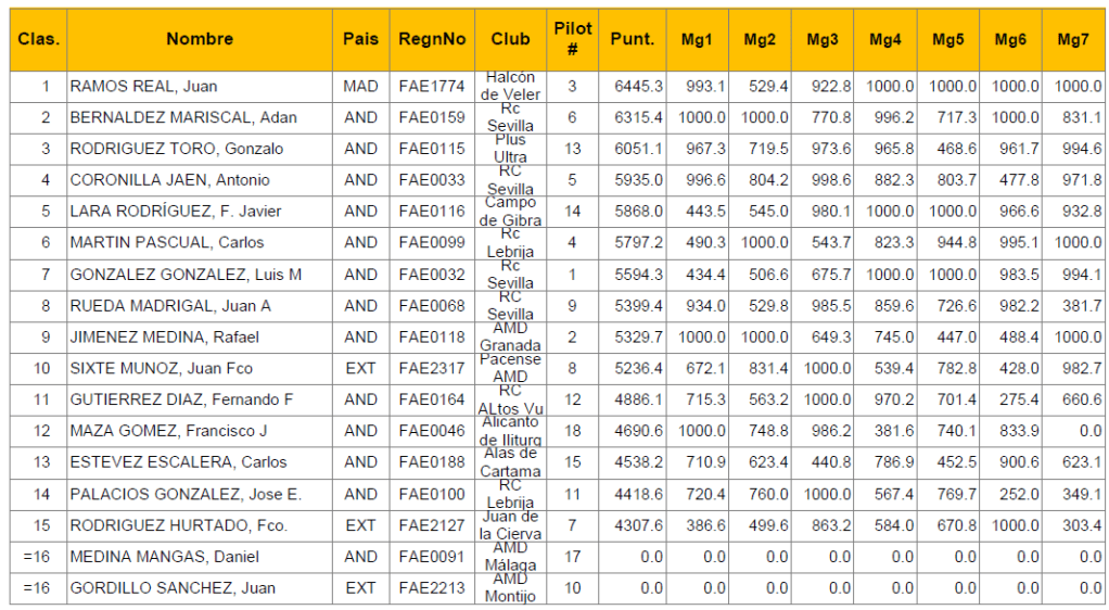 El mas regular (en cuanto a posición) fué Adán, siempre estuvo primero o segundo. En cuanto a puntuaciones de los vuelos creo que fué Juan Ramos, aparte de los cuatro miles en sólo uno de los tres restantes vuelos no llegó a superar los novecientos puntos.