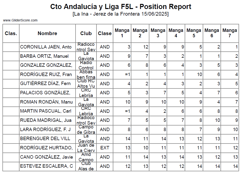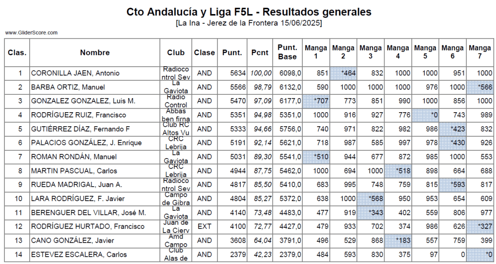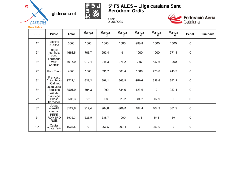 La prueba también ha sido valedera para la Lliga Catalana F5J con el siguiente resultado: