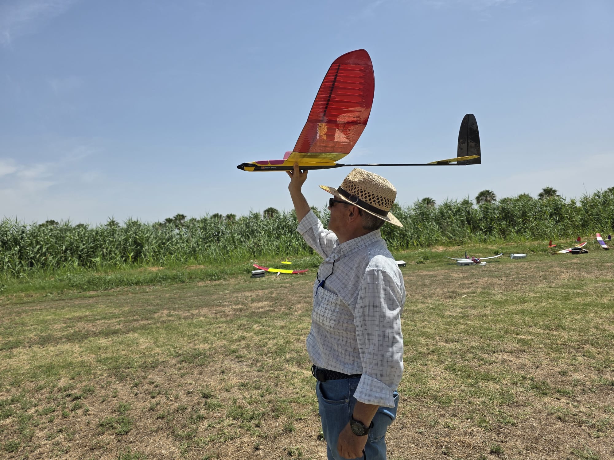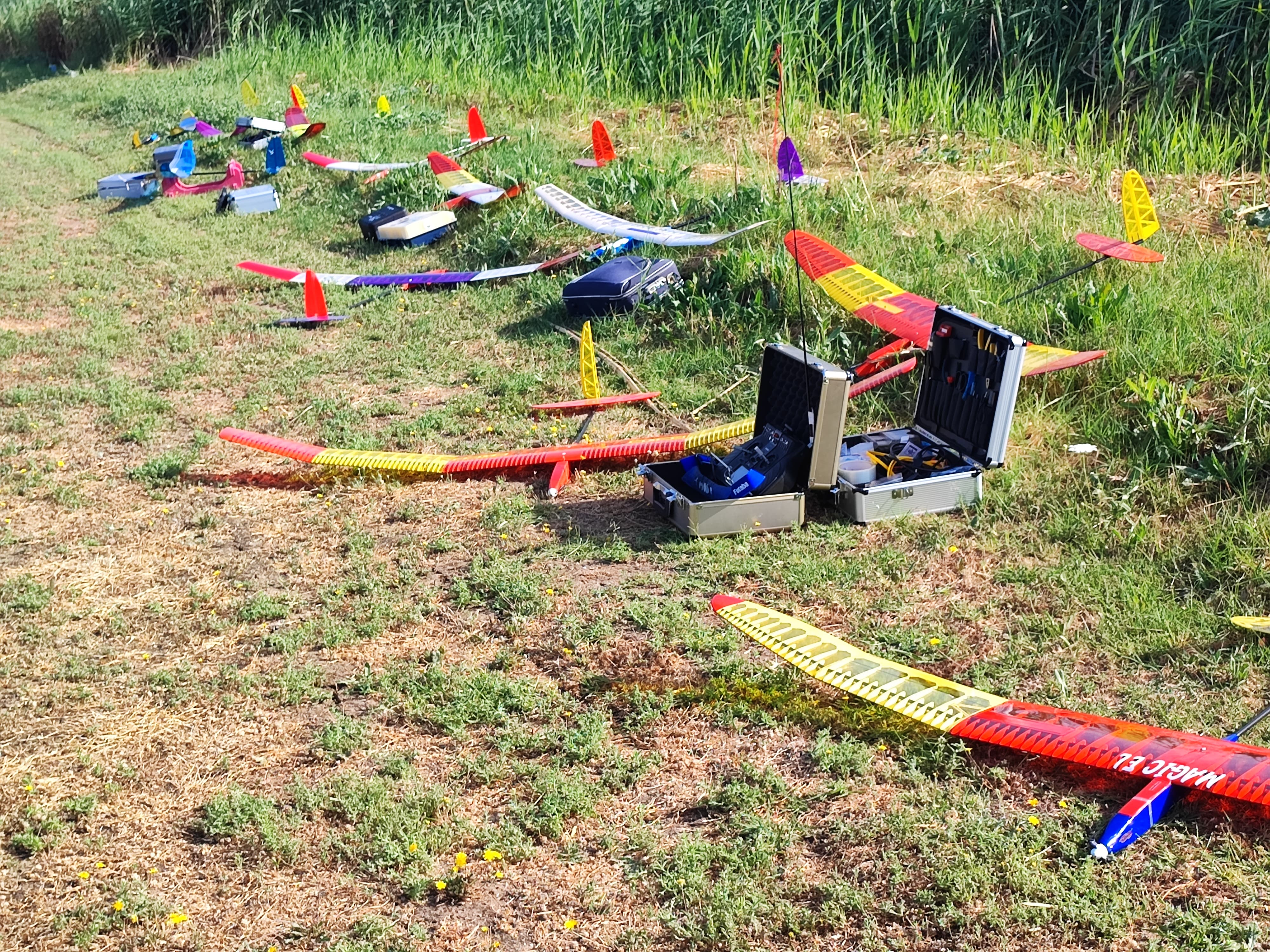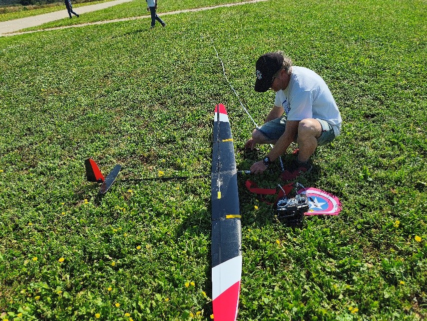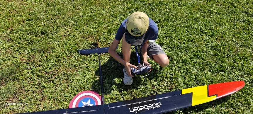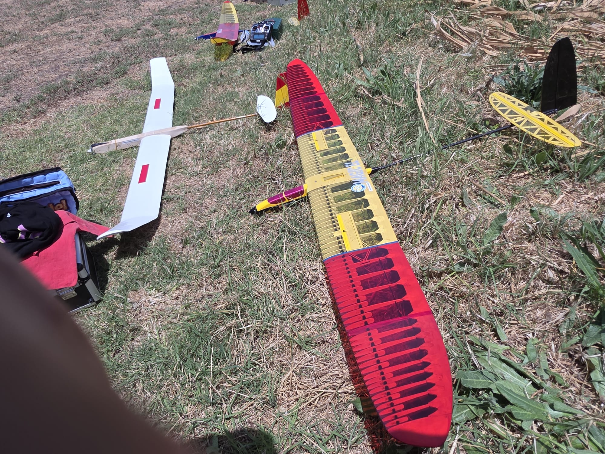 En esa misma manga, me dejó de funcionar el servo de profundidad. Por suerte el velero fue saliendo y quedó centrado. La siguiente manga, por listillo, lo dejé en el tejado del hangar… entre la vista y la tontería. Por suerte Xavi Costa, ágil y valiente, me lo recuperó. ¡Gracias, Xavi! También Kiku Roura tuvo su ración de problemas: se le averió el flap izquierdo.