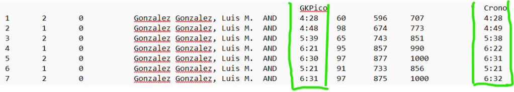 Y como me gusta cotillear con la información de la que dispongo una comparación de los datos del crono de mi GKPico y los anotados por los cronometradores en las hojillas de vuelo