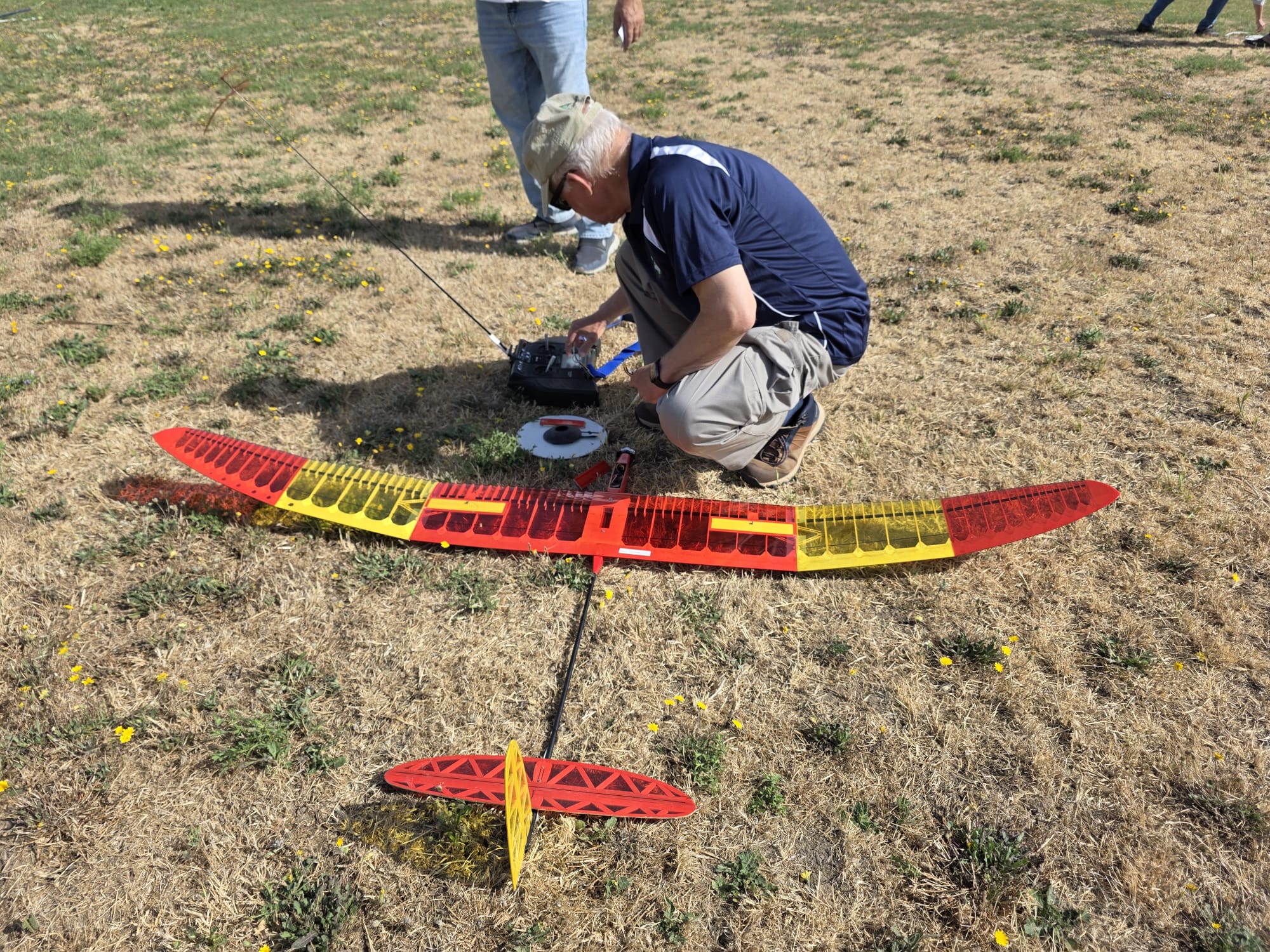 A las 8:30 ya estábamos empezando a trimar los veleros. Fue entonces cuando descubrimos que, bajo la hierba, nos acechaban unas traicioneras piedras. El primero en darse cuenta fue Fernando Valls Castella: en su primer aterrizaje se topó con una piedra, ¡cuaderna para llamas despegada! No se lo pensó mucho y rápido sacó su segundo velero. Lo trima… y ¡ostras, otra piedra! Otra cuaderna despegada. Hoy la suerte no estaba de su lado, pero a persistente no le gana nadie. A por el velero de SOS, que no se rinde.