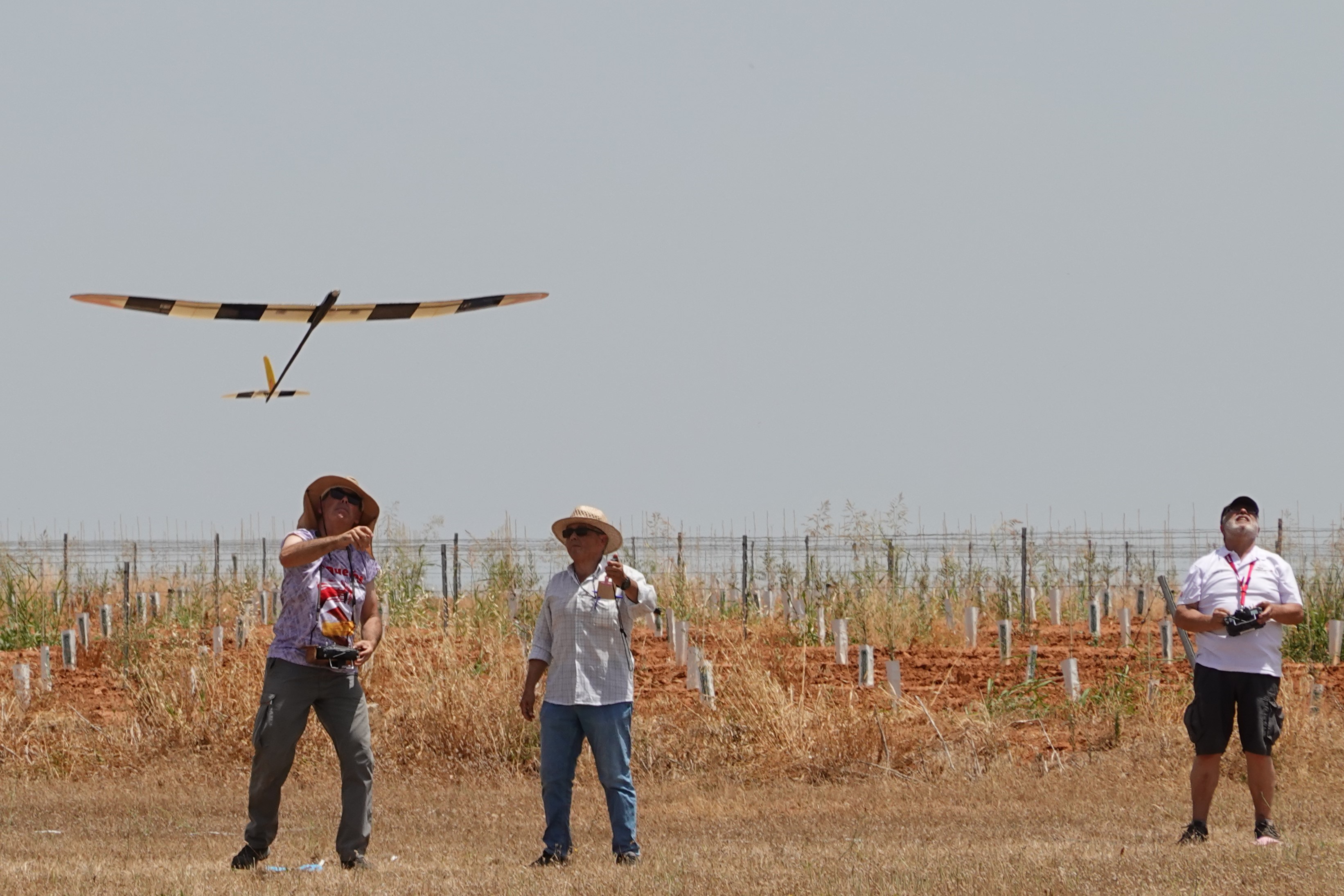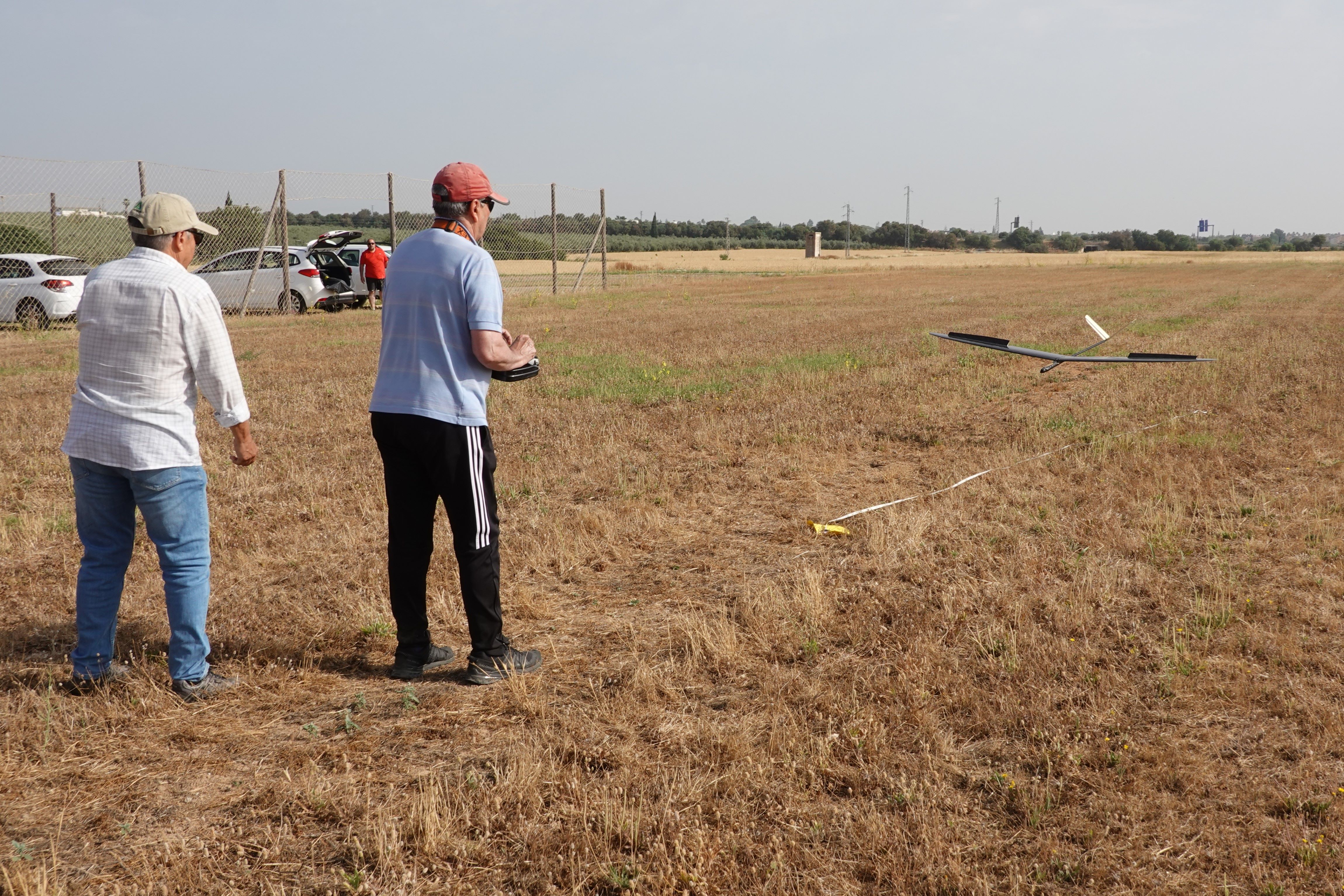 En la tercera manga ya había mucha actividad: ascendencias, descendencias, algunos motores arrancando para volver, y empezamos a arriesgar. En la cuarta manga, Romero se topa también con una piedra, esta vez intentando hacer diana. Parte el eje del motor de cuajo. La mala suerte cambiaba de piloto. Solución improvisada: cono y hélice pegados con cinta, y a lanzar el velero a mano en todas las mangas restantes. Dio motor solo para cumplir el reglamento, ¡y casi coge una térmica! A tesón tampoco le gana nadie.