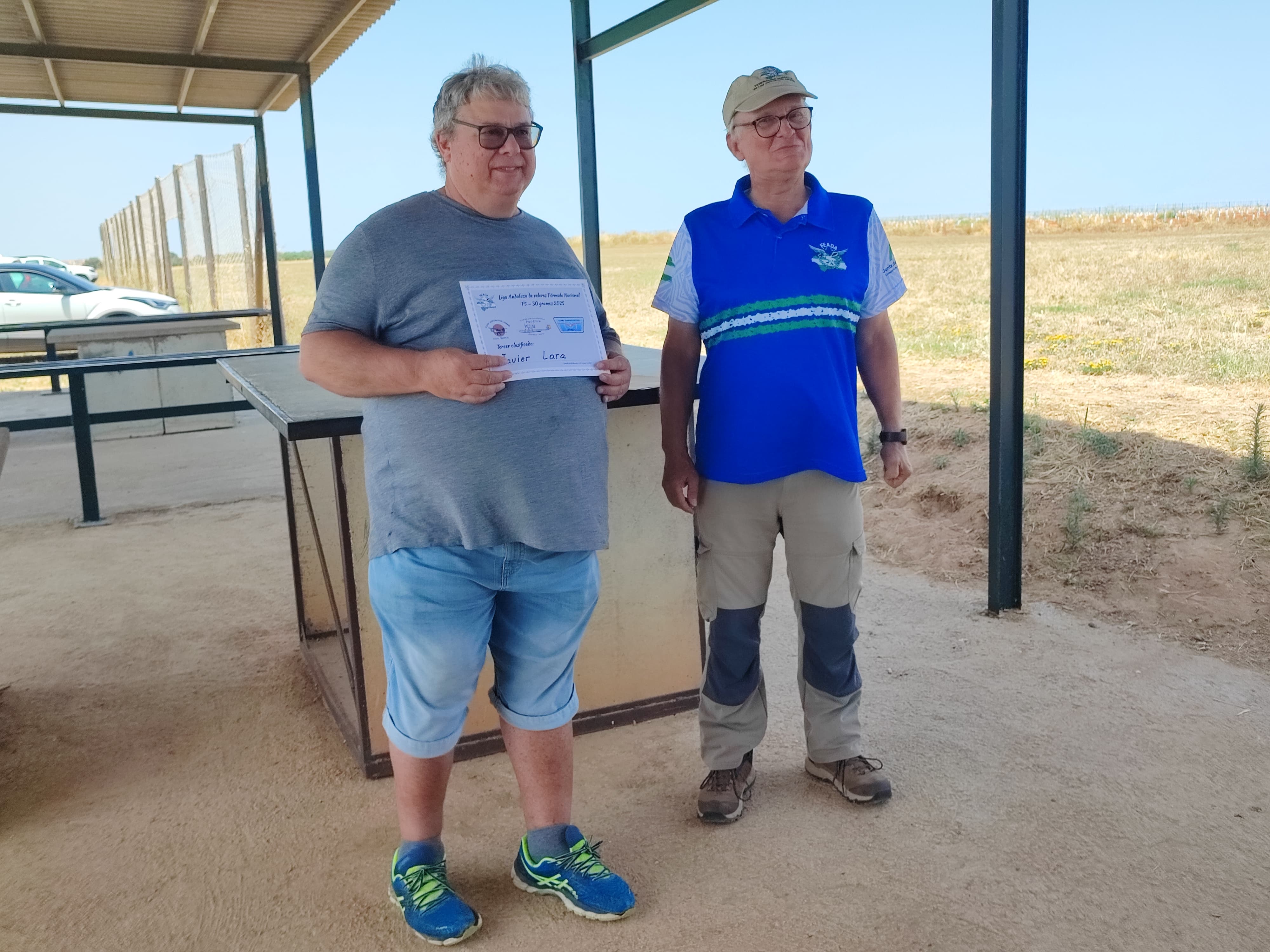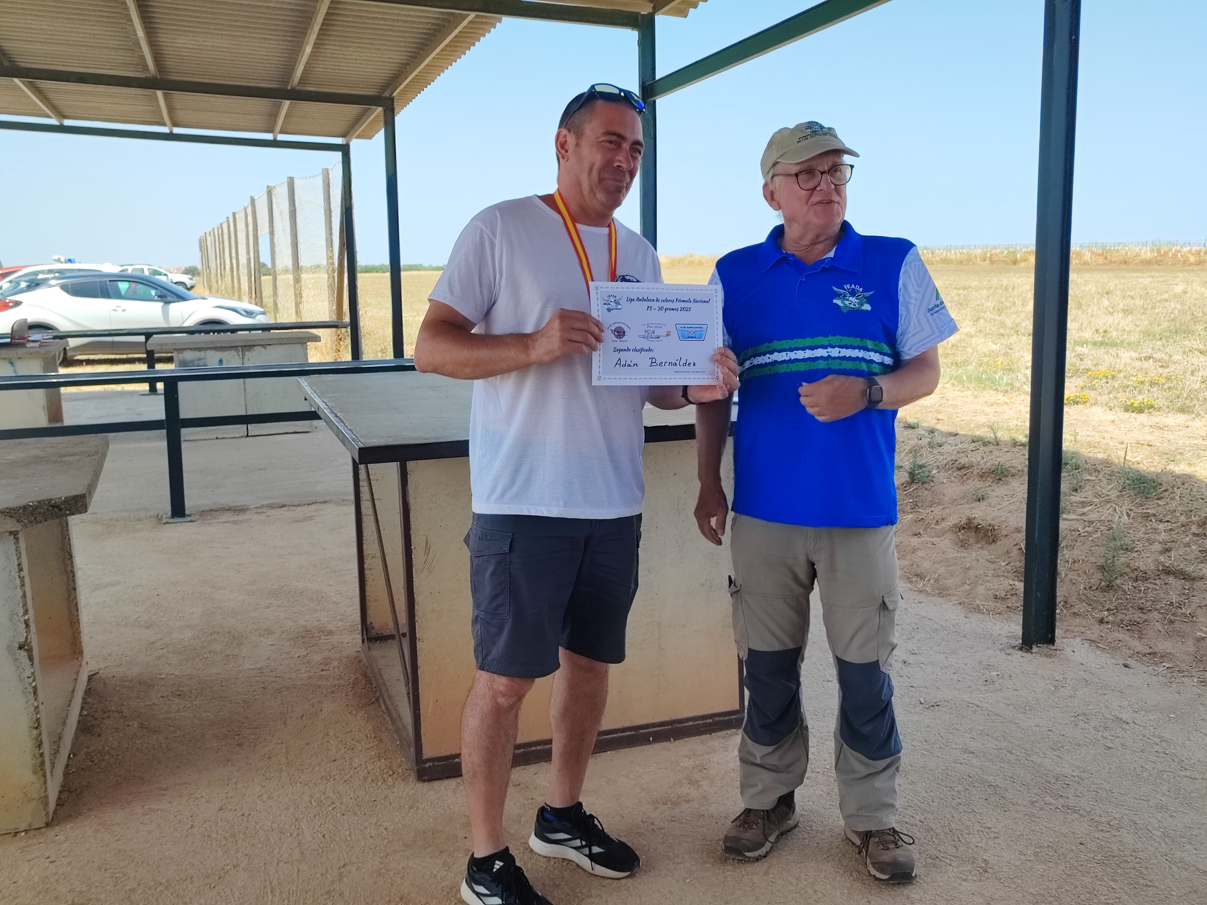 Algunos siguen pudiendo ponerse de rodillas para la foto, otros necesitan ayuda (o una silla 😉 ) todos estabamos «fresquitos» en ese momento, no se acabaría igual, alta temperatura y la falta de viento no facilitarian la estancia de pilotos y cronometradores en la pista. Menos mal que el agua, mantenida fresquita por la organización, alivió ese ‘calentón’.