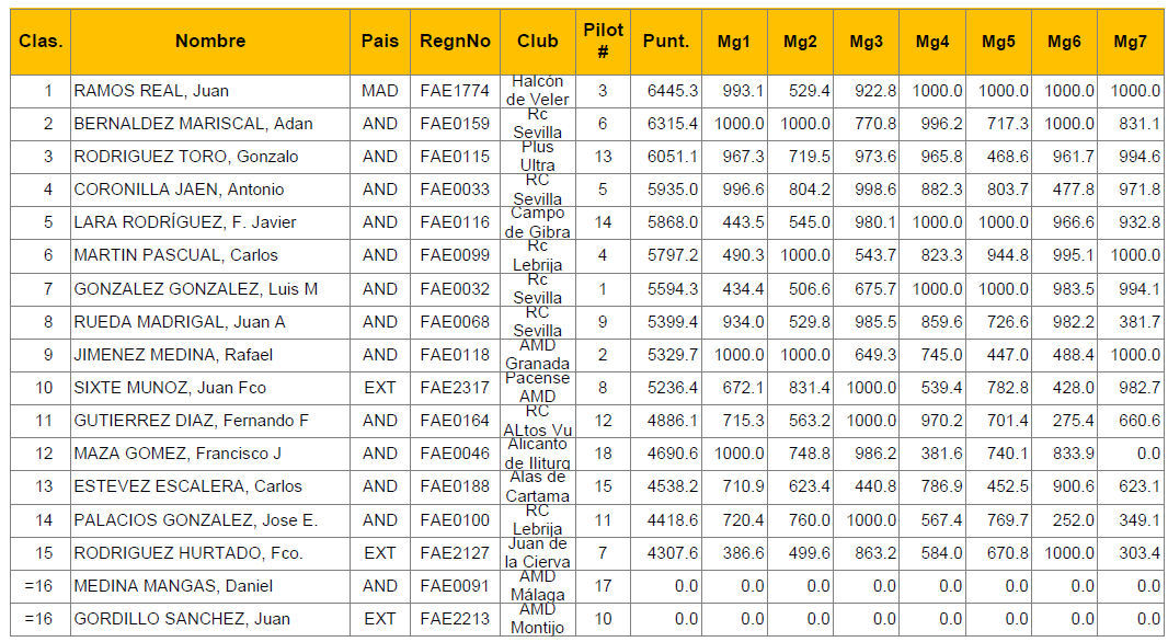 El mas regular (en cuanto a posición) fué Adán, siempre estuvo primero o segundo. En cuanto a puntuaciones de los vuelos creo que fué Juan Ramos, aparte de los cuatro miles en sólo uno de los tres restantes vuelos no llegó a superar los novecientos puntos.