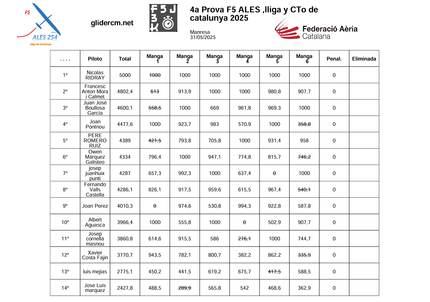 La prueba también ha sido valedera para la Lliga Catalana F5J con el siguiente resultado: