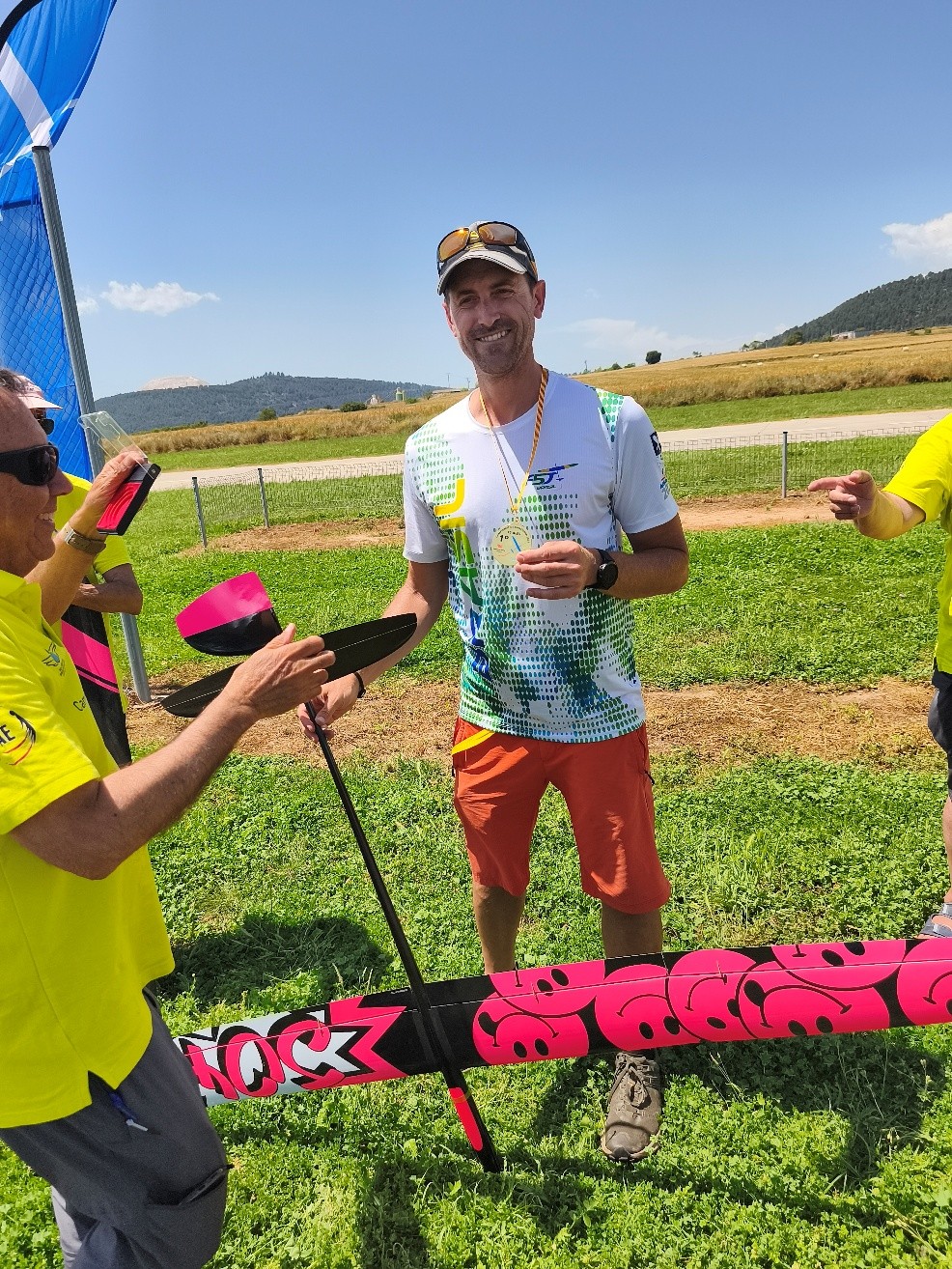En esa misma manga, me dejó de funcionar el servo de profundidad. Por suerte el velero fue saliendo y quedó centrado. La siguiente manga, por listillo, lo dejé en el tejado del hangar… entre la vista y la tontería. Por suerte Xavi Costa, ágil y valiente, me lo recuperó. ¡Gracias, Xavi! También Kiku Roura tuvo su ración de problemas: se le averió el flap izquierdo.