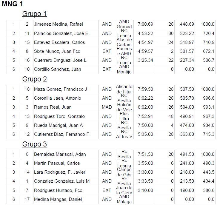 Estas condiciones favorecieron que los mejores pilotos pudieran mostrarnos todo su talento. Julio estuvo intratable, con una regularidad envidiable. Vuelos de 9.55, diana y cortes entre 43 y 125 metros le hicieron acabar la fase clasificatoria en primer lugar, ganando todas sus mangas a excepción del descarte. Los siguientes clasificados Toni Mateu, Jorge Medina y Nicolas Ridray tampoco le fueron a la zaga. Prácticamente todos los cortes por debajo de los 100 metros y siempre consiguiendo los tiempos marcó una diferencia entre ellos de solo 140 puntos. A partir de ahí un salto importante con los demás pilotos que hicimos lo que pudimos…