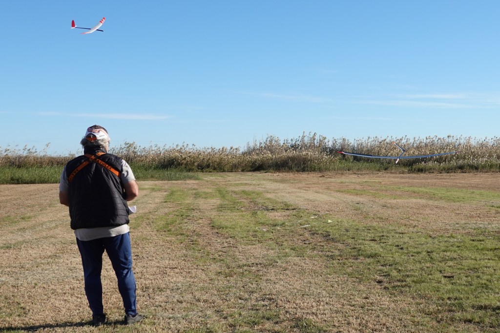 La mañana estuvo fría al comienzo y menos fría al final (no descubro nada), el sol lució e hizo muy llevadera la temperatura, el viento del día anterior se transformó en una brisa agradable y los vuelos fueron bastante divertidos, con buenas ascendencias y algunas pocas descendencias, no siendo difícil hacer los 10 minutos máximos, salvo el último vuelo de la mañana que ganó Diego con solo 3 minutos y 48 segundos.
