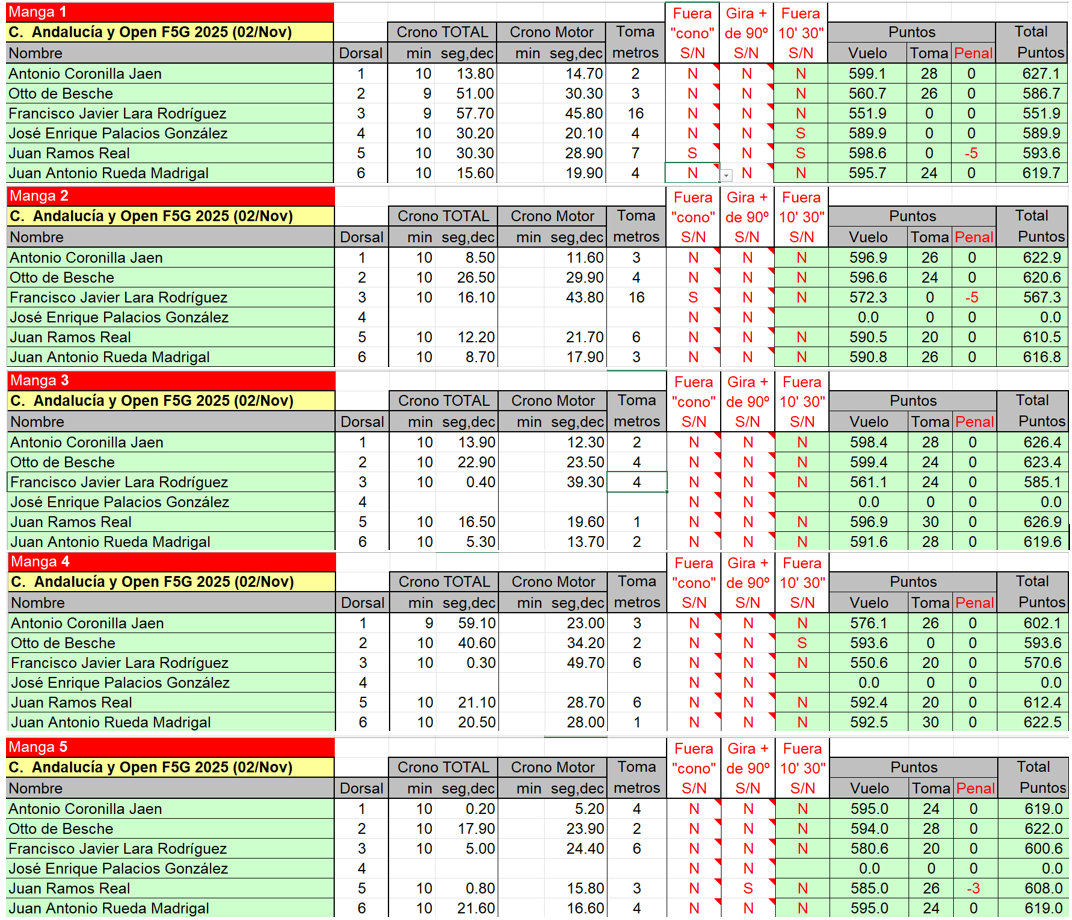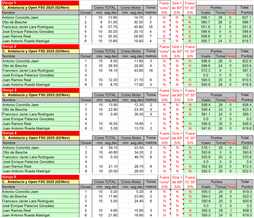 Para el concurso estaba previsto realizar cinco mangas, si se llegaba se eliminaría la peor de cada concursante y para hacerse una idea de los vuelos… los tiempos de ellos