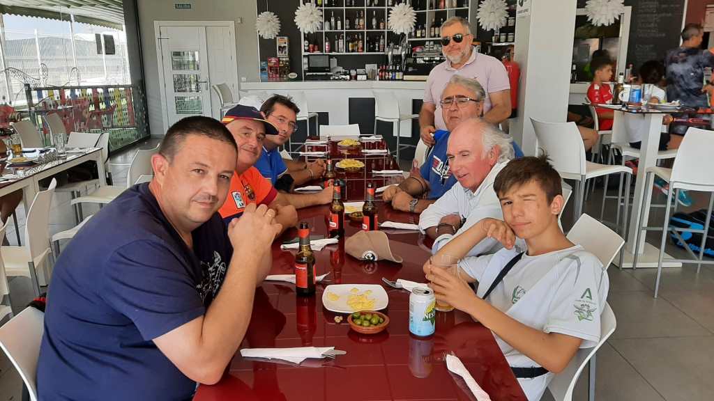Se anunció que se harían cinco mangas o, en su caso, la última sería la que estuviera disputándose a las 14:00. Con buen criterio la organización decidió que la habitual comida de hermandad una vez finalizado el campeonato se celebrara en algún lugar acondicionado para ello y con las correspondientes medidas anti COVID (aunque para las fotos retiráramos las mascarillas), acabados los vuelos nos trasladamos al Club PADEL5 en Linares