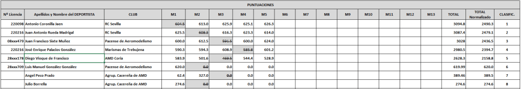 En el primer vuelo, marcado en amarillo, podemos ver que el tiempo de vuelo excede los 10’30» por lo que la toma puntua cero (pese a que la toma sólo fué a tres metros del centro); como el tiempo de motor fué 30″ y el de vuelo 10’33» resulta que se ha excedido el tiempo sin motor en en 3,3″ y es por ello que la puntuación del vuelo es 596.7 (600-3.3). En el cuarto vuelo podemos ver que el exceso de los diez minutos de vuelo y el tiempo de motor es mucho mas cercano, por ello la puntuación del vuelo solo está penalizada en 0.7 puntos (24.4 – 23.7) y como la toma es a dos metros, la puntuación de aterizaje añade 28 puntos haciendo un total de 627.3 puntos, casi el máximo (630). En esta modalidad, al no volarse por grupos no procede esa conversion a 1000 del mejor vuelo y al resto de proporcionalmente; se suele despegar con una cadencia de cuatro minutos, a los efectos de igualmente separar las tomas ese tiempo aproximadamente.