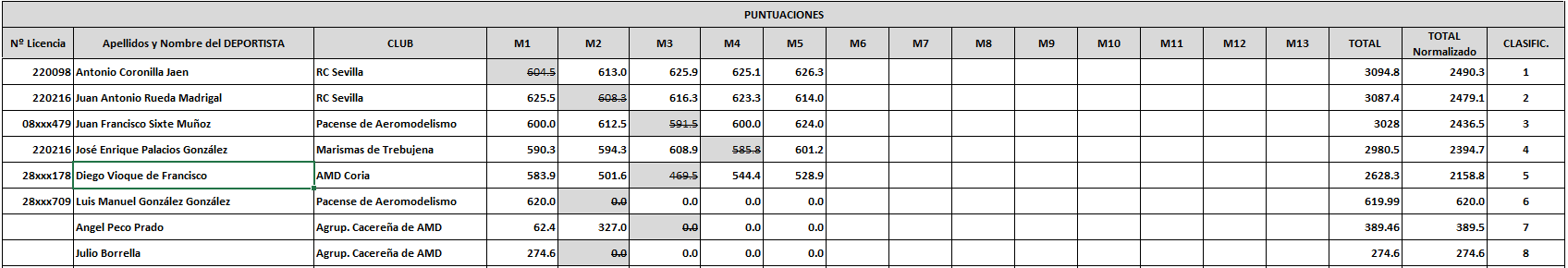 Para la clasificación final se suman los puntos obtenidos en todos los vuelos eliminando los obtenidos en el peor de cada concursante. El Campeón sería Antonio Coronilla, subcampeón Juan Rueda y tercer clasificado, Juan Sixte.