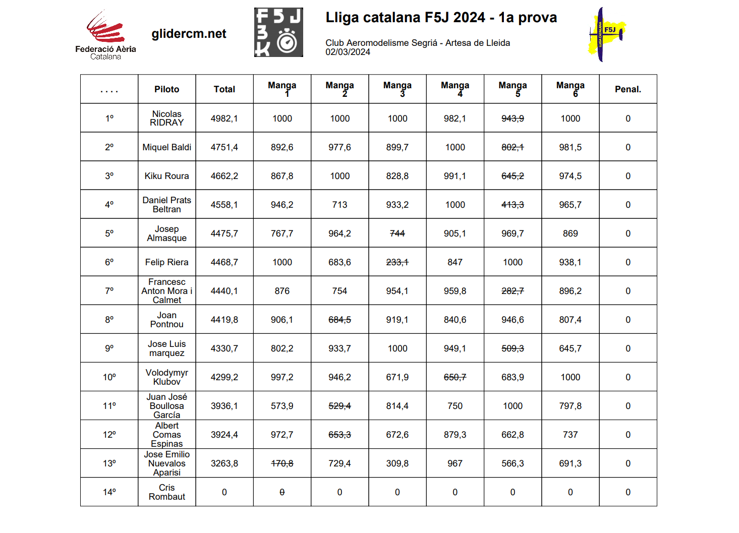Una vez hecho el podio se procedió a recalcular la Liga de Cataluña F5J 2023 , resultando así la clasificación: