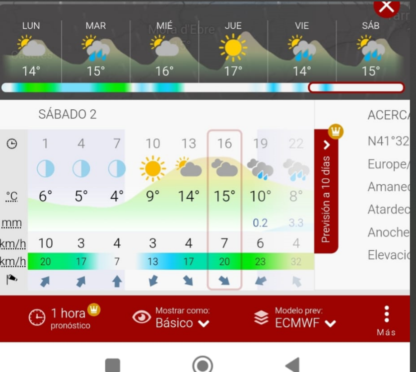 Viento flojo del Noroeste y cambio a Sur Este sobre la manga 3ª, en la que salió el sol subiendo la temperatura de unos 12°C a unos 17°C .