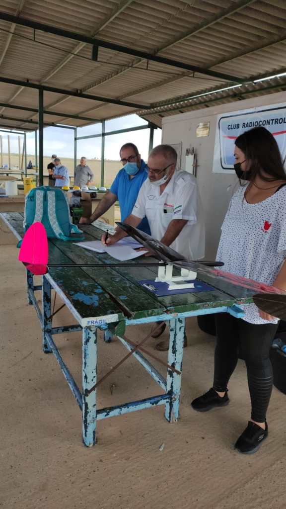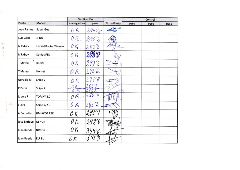 En la primera reseña de este Campeonato omitimos casi toda la parte técnica del mismo, en esta se dirá algo más. Como verificación de los modelos se procedió por parte de la Directora del Concurso, Leticia Cobos, al pesado de los mismo y a la comprobación de que no excedían la envergadura máxima (limitada en el reglamento a 1500 mm). La pesada fue mas técnica, se hizo con un GliderCG dada su facilidad de uso; la comprobación de la envergadura fue un poco más rústica… se marcaron los límites en una de las mesas metálicas y se comprobaba que los extremos del ala, en invertido, entraban entre los límites (no era muy científica la forma pero tela de eficiente y rápida jejeje)