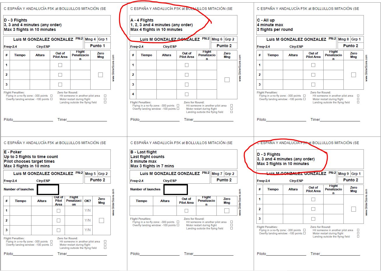 Si se programa un concurso en el que se realizara una sola vez cada tarea (cinco tareas = cinco vuelos) y en un solo grupo de pilotos, utilizando los audio de tiempo que proporciona GliderScore, y sin interrupciones, se tardaría una hora y veinte minutos (1h 20′) en su realización, si fueran dos grupos de pilotos, como se puede suponer serian 2h 40′.