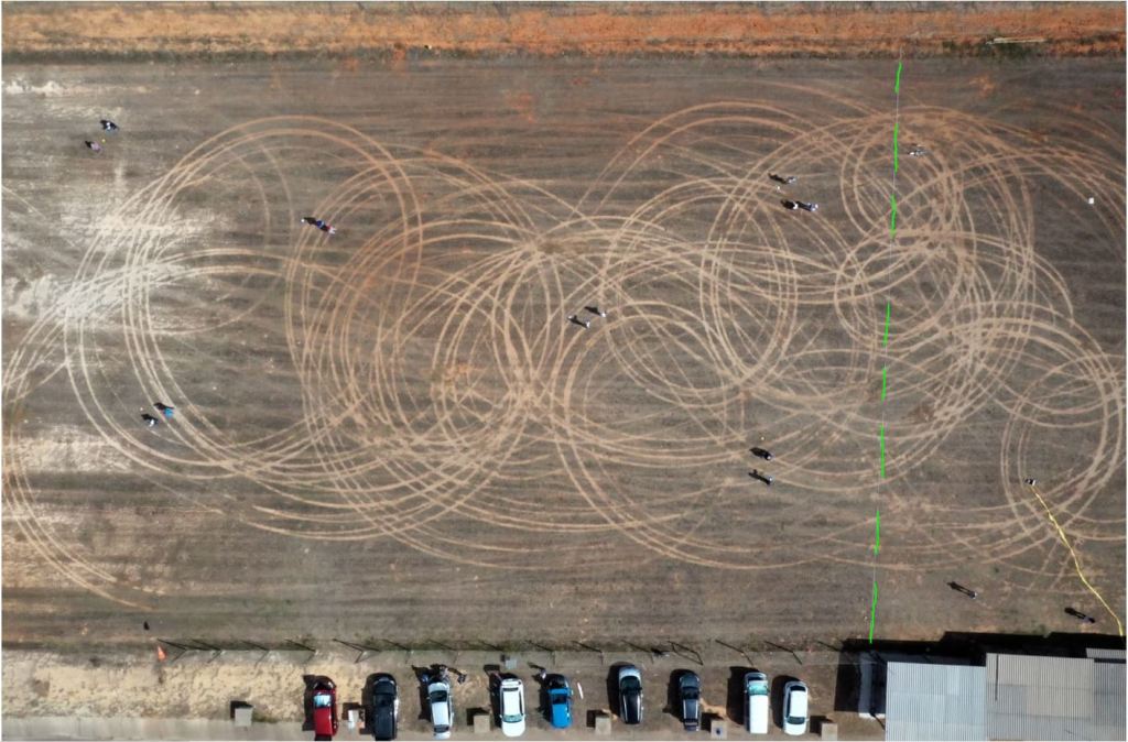 Tanto el inicio como el final del vuelo han de realizarse dentro de el punto de aterrizaje definido por un hexágono circunscrito en un diámetro de 10m, aquí nosotros por simplificar usamos un círculo de 10m de diámetro solo que delimitamos en el suelo con un Spray de marcación biodegradable, es sencillo y rápido de hacer. En caso de aterrizar fuera del círculo se incurre en una penalización.