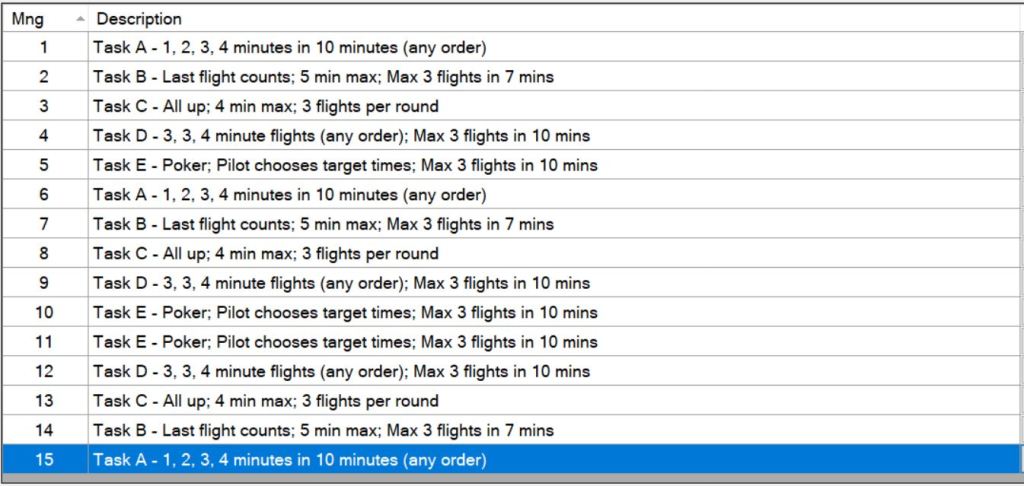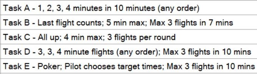 La quinta y última de las tareas posibles, la mas larga en su descripción. Aunque podría definirse como ‘hacer 9’59 en uno, dos o tres vuelos‘, con la particularidad que antes de despegar hay que decirle al cronometrador que tiempo se va a hacer, éste lo anotará y sólo lo dará por válido si el objetivo es alcanzado. Caso de no alcanzarlo deberá repetir el vuelo para el mismo ‘objetivo’. Si se solicita «all in» sólo podrá realizar un vuelo. Cada a vuelo adicional tendrá una penalización de 10 puntos y si el objetivo no es alcanzado no se tendrá en cuenta el tiempo realizado para la puntuación y caso de disponer de algún vuelo más no podrá cambiar el objetivo a conseguir.
