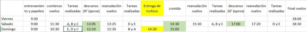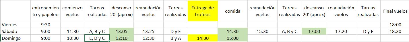 Si en este primer campeonato somos sólo diez u once pilotos, se dividirían en dos grupos (dos vuelos por manga) asimilándose lo de ‘MANGA’ a ‘TAREA’ en esta especialidad y procuraremos hacer tres rondas de cada una de las tareas, quince vuelos por piloto. El transcurrir del concurso podría ser: