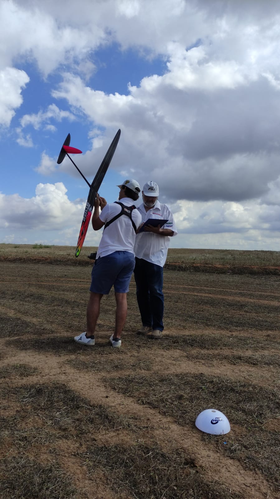 La reunión inicial de pilotos fue bastante rápida y sin ninguna complicación, alguna duda resuelta sobre la marcha y seguidamente a prepararse para los vuelos. La tercera ‘regla local’ estaba relacionada con la parada del crono a la finalización (o interrupción) del vuelo. El reglamento dice que «el cronometro se parará cuando el modelo se detiene en el suelo…«, salvo en 50g en el resto de modalidades se para el crono cuando el avión toca el suelo (o cualquier elemento a él fijado) por primera vez, por ello se instruyó a los cronometradores en que la parada del cronometro se realizara justo en el primer contacto, sin esperar a la parada del modelo, momento que puede ser mas difícil de concretar. La parada (del crono) con la señal de final de tiempo de trabajo no se modificaría lógicamente, ni que el modelo no podría agarrarse por el piloto para la toma antes de su parada completa, especificando que… en el suelo.