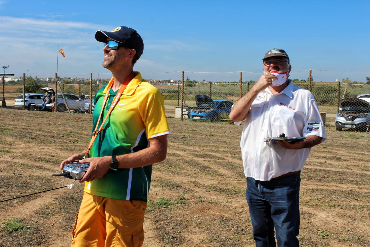 Como sabemos, o dice el reglamento, la carga alar del modelo no puede ser inferior a los 12g/dm2 pero se está hablando de la posibilidad de que si lo sea, en algún país no se ha puesto pega a que participe algún modelo con menos carga alar. Y hablando de cambios o posibles cambios en el reglamento, en Sevilla sólo se hicieron tres excepciones al mismo como reglas locales («Local Rules» para los entusiastas de los anglicismos). Dos de ellas relacionadas con el ‘Área del Piloto’, definida en el Reglamento como la superficie de un hexágono de cinco metros de lado que el piloto debe usar para los despegues y tomas, no permitiéndose el despegue fuera de ella y penalizándose (-10 puntos) la toma fuera de ella, el motivo era la complejidad o mas bien el trabajo adicional para la organización en su montaje y, sobre todo, el embrollo que supondría el cambio de dirección de la línea de vuelo si el viento cambiaba de dirección, cosa fácil (y que pasaría realmente a lo largo del concurso); se tomó la opción de definir una «Zona de Pilotos» delimitada por dos cintas en el suelo separada entre sí unos 70m y colocadas a todo lo ancho de la pista dando la libertad de colocación a los pilotos siempre y cuando no se estorbasen entre ellos.