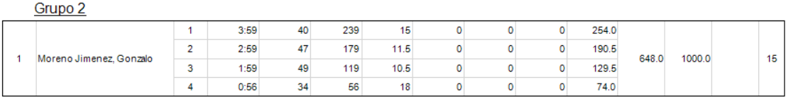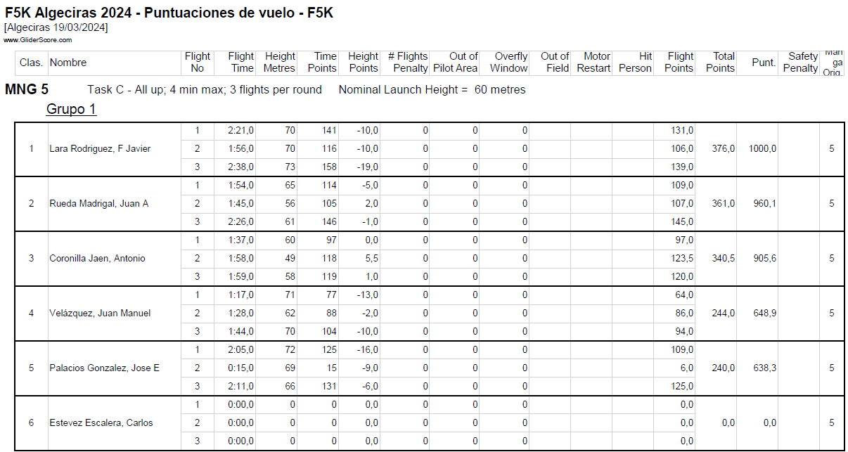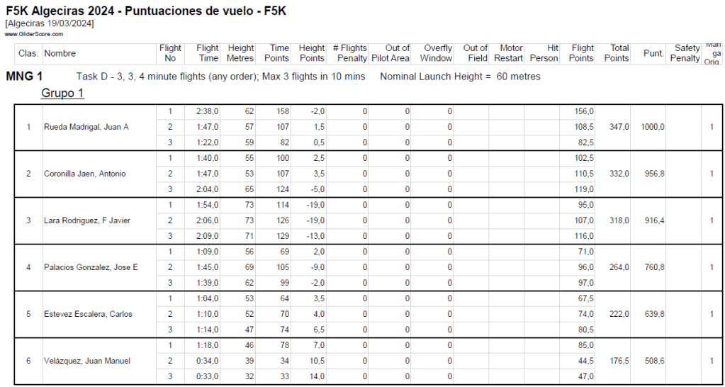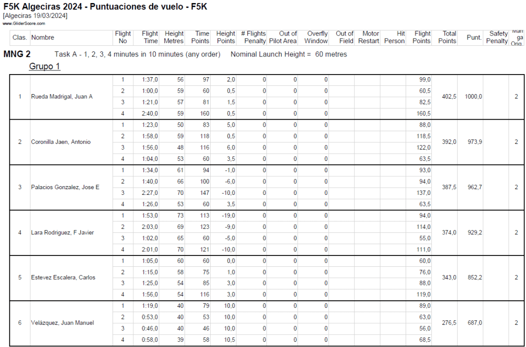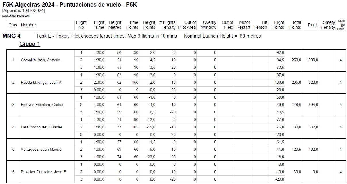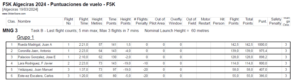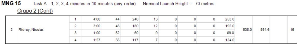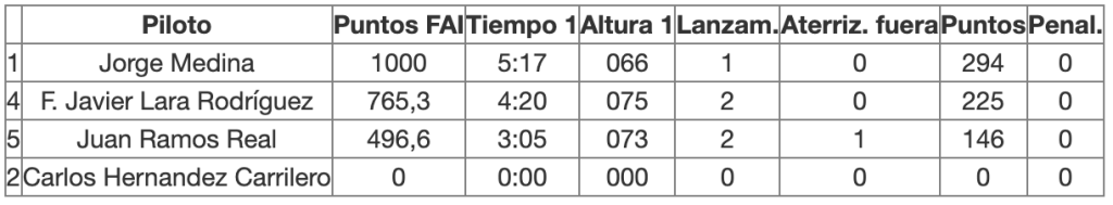 En primera manga tendríamos que hacer como prueba el 1,2,3,4 consiste en realizar cuatro vuelos de 1, 2, 3, 4 minutos en el orden que se quiera en 10min de tiempo de trabajo. en esta prueba lo importante es no pasarse nunca del tiempo máximo permitido y recoger y lanzar el modelo rápido… ojo que más de uno tendrá agujetas de tanta sentadilla. En el primer grupo acabó de la siguiente manera:
