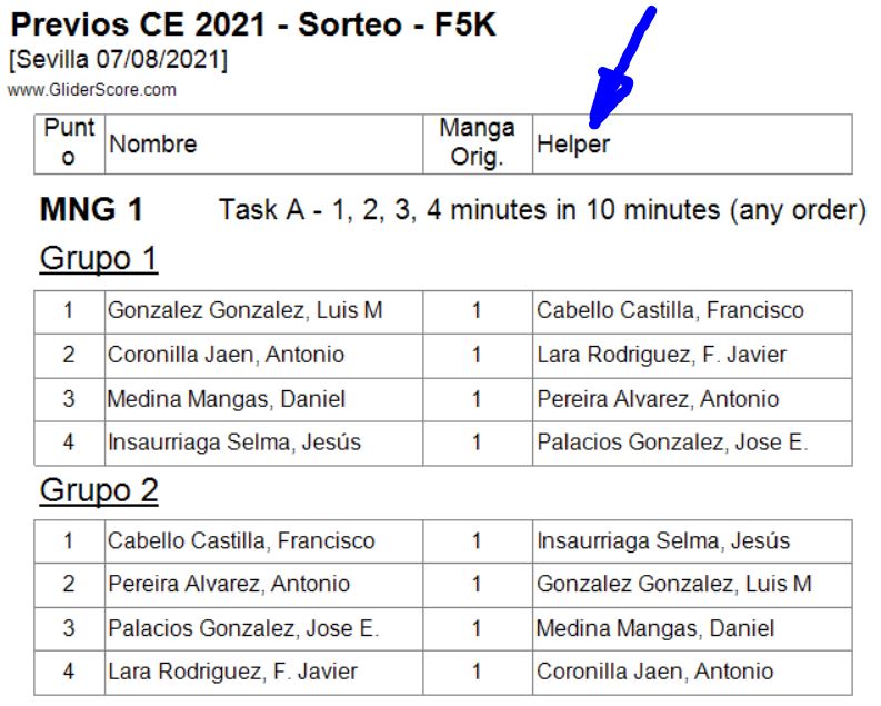 Para animar a otros organizadores en el sentido de quitarles un problema organizativo serio, quizás el que más, como es el de conseguir cronometradores ‘fiables’, GliderScore permite que en el sorteo se asigne ayudante (‘Helper’) a los pilotos de entre ellos mismos… lo que hemos hecho en mas de una ocasión en concursos de cronometrar y volar lo resuelve por sorteo la aplicación, evitando suspicacias y teniendo en todo momento, cada uno de los pilotos, muy claro que función tiene en cada vuelo (grupo) de cada manga ya sea de piloto de ayudante o descansando, todo dependerá del numero de grupos en los que se dividan los participantes