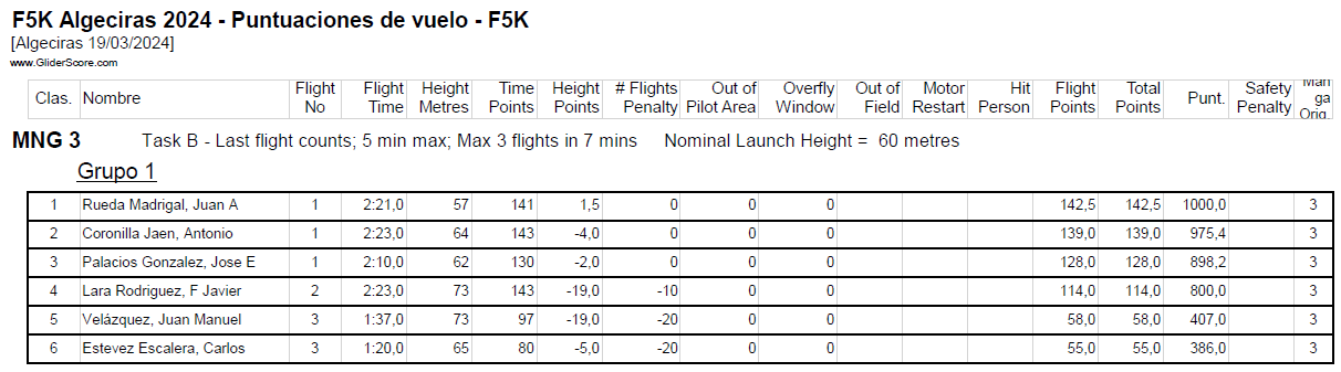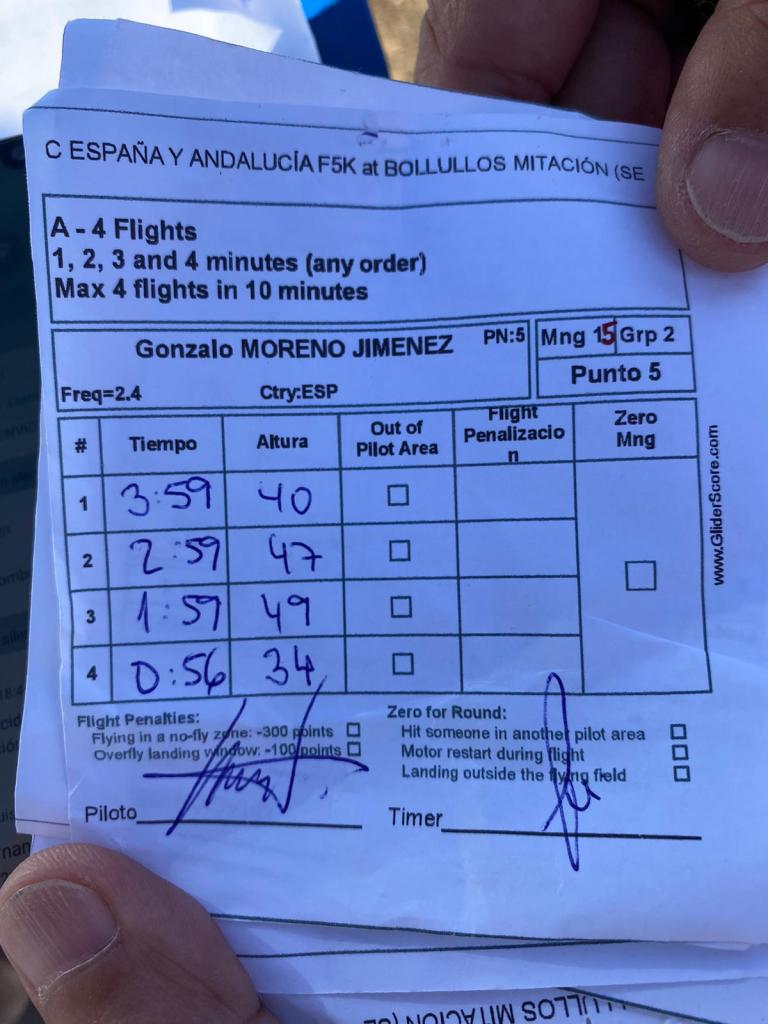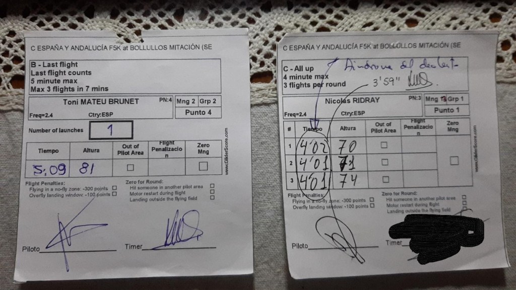 Y aquí alguno le patinó la neurona y mezclo reglamentos…. Un servidor hizo los dos primeros vuelos de 3 minutos convencido de que el tiempo máximo de vuelo eran 3 como en F3K y no son 5…. por suerte la pifia pudo ser enmendada, destacar la regularidad de Juan Ramos en el segundo grupo con tiempos muy cercanos al máximo.