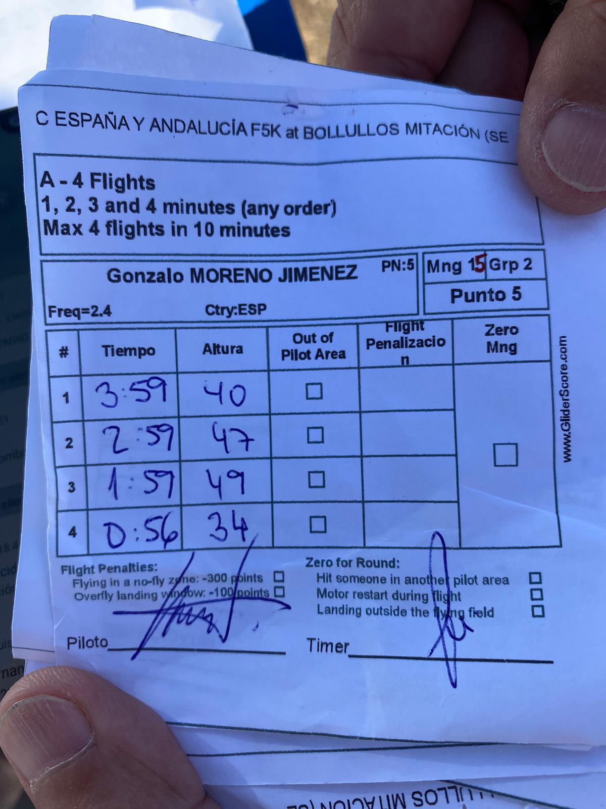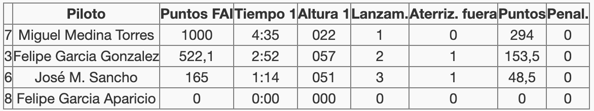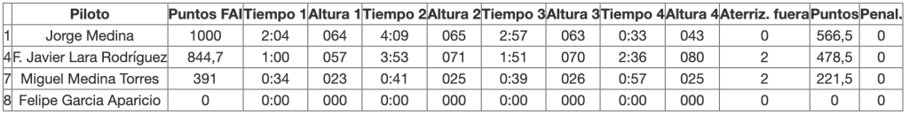 Resaltar el vuelo de Miguel Medina que con solo 22m de ascenso consiguió hacer 4:35 debido a una infra motorización su modelo no superaba en los 7 segundos de motor esa altura pero que bien le vino para obtener una bonificación por altura muy interesante.
