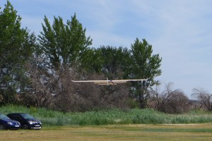 Un último apunte sobre la dificultad del concurso provocada por la orientación del viento dominante: se aterrizaba teniendo que pasar por encima o por delante de los frondosos árboles que adornan el camino de entrada al campo de vuelo. Pero calcular la distancia a la que se encuentra el velero y la altura del mismo respecto a los obstáculos a veces no es tan sencillo y hubo más de un percance por este motivo. Al estar ahora tupidos de hojas, como corresponde a esta época del año, que la descendencia te dejara el velero por detrás de las altas copas de los árboles suponía dejar de verlo, y si viéndolo es complicado calcular las distancias si lo dejas de ver ya ni te cuento.