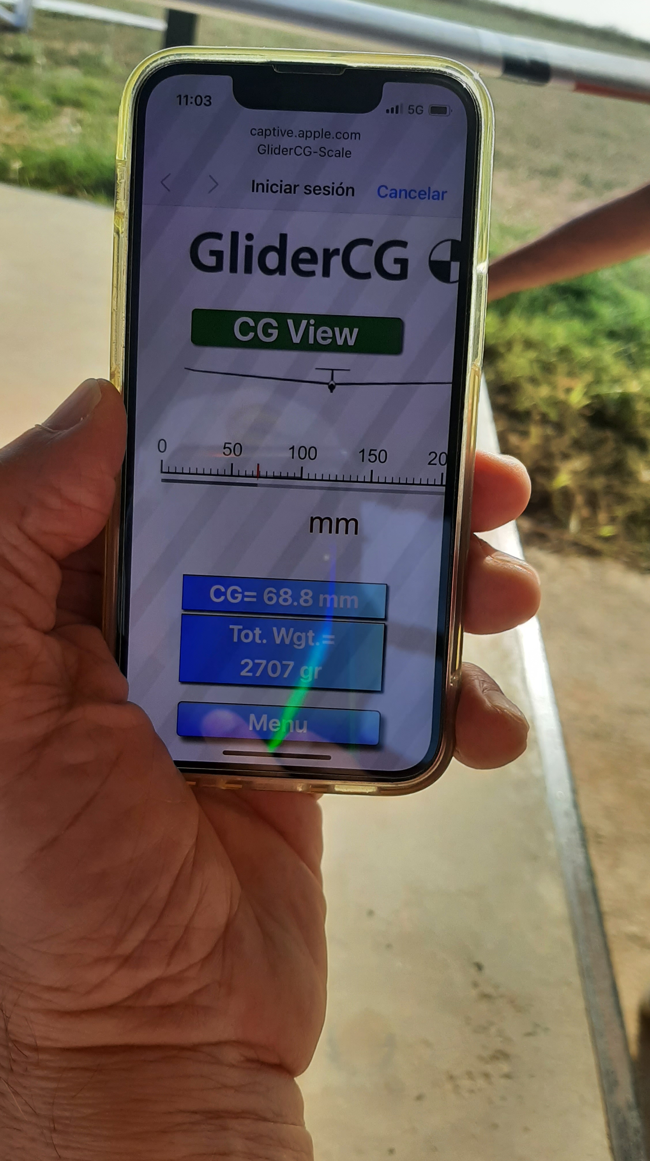 Cinco de los seis modelos presentes y la maquinita facilitada por Antonio Pereira (nuestro querido ‘larguito’) para comprobar los CG de los modelos, y de camino chinchorrear el peso de los mismos, cosa que hoy no fué del todo riguroso habida cuenta que el viento no favorecía la precisión en las medidas.